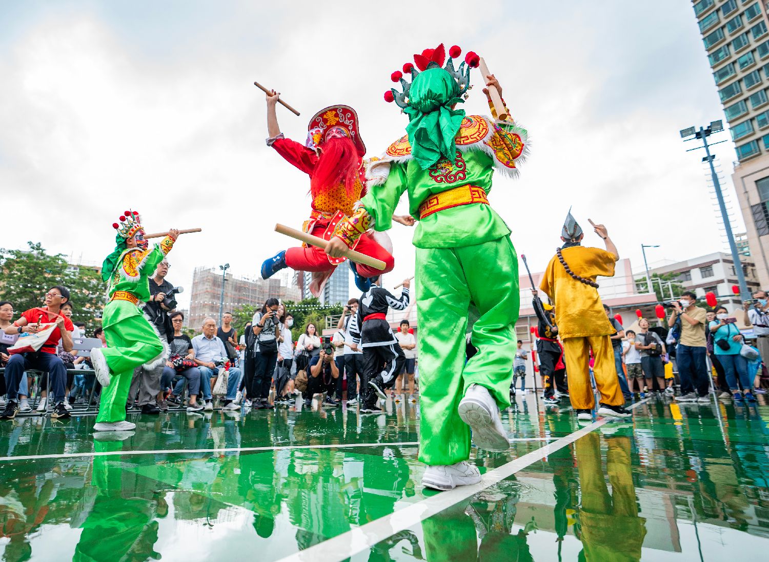 7月30日,“潮玩夜市”市集活动在香港亚皆老街举行,英歌舞、潮州抢孤、潮汕美食等众多文化活动令市民冒雨前来体验,度过周日时光。图为英歌舞表演。(中新社)