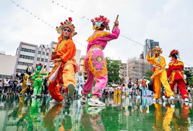 表演者冒雨表演英歌舞。(中新社)
