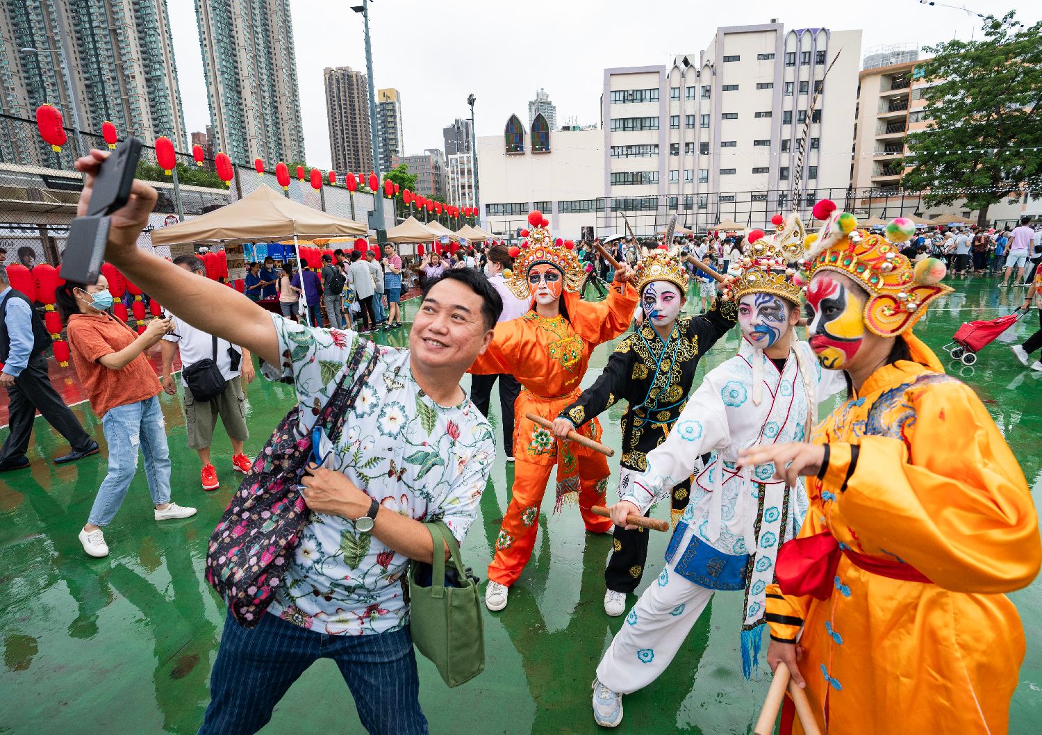 民众与英歌舞表演者自拍合影。(中新社)