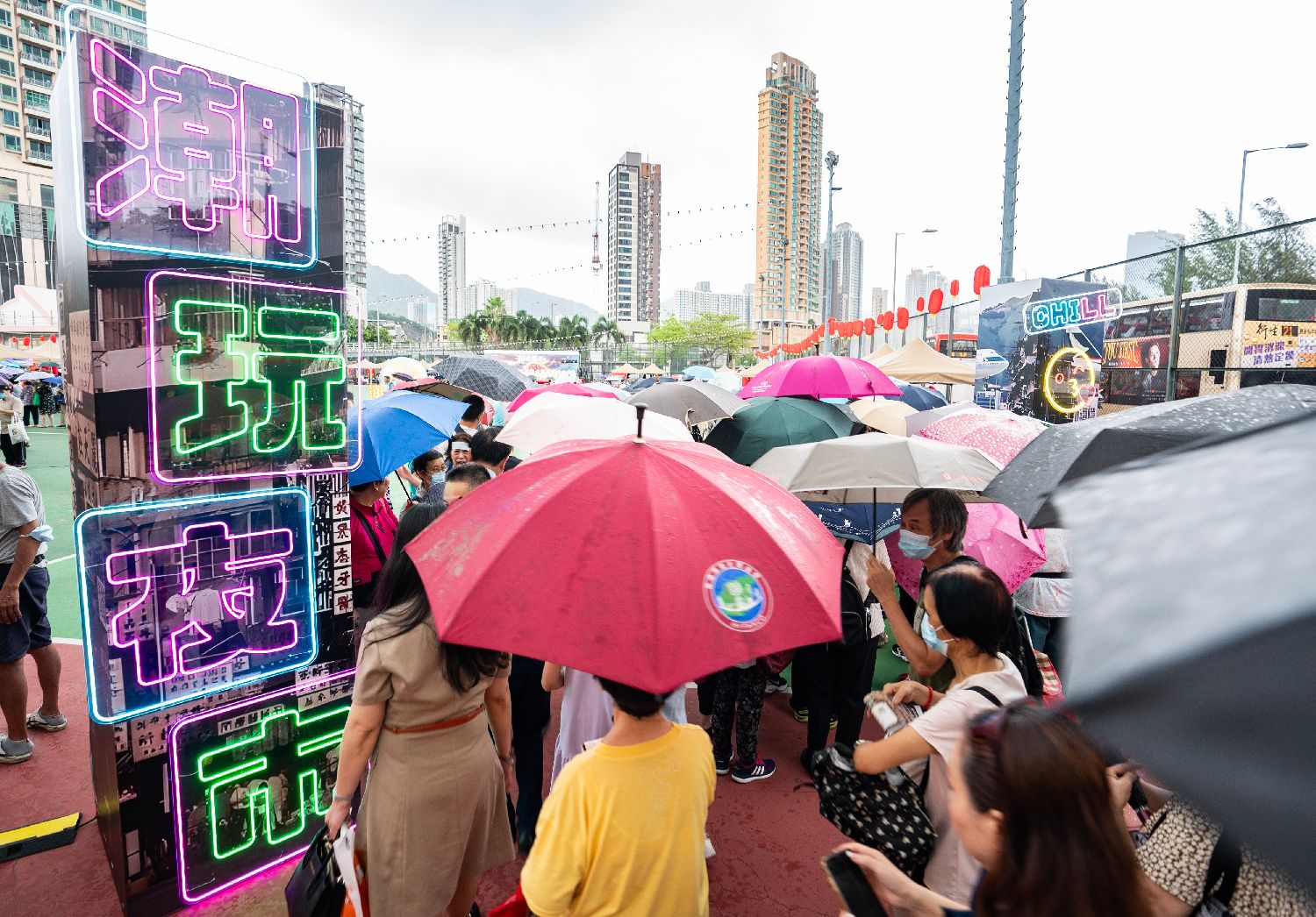 “潮玩夜市”市集活动吸引民众冒雨体验。(中新社)