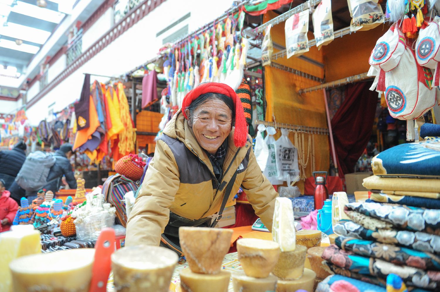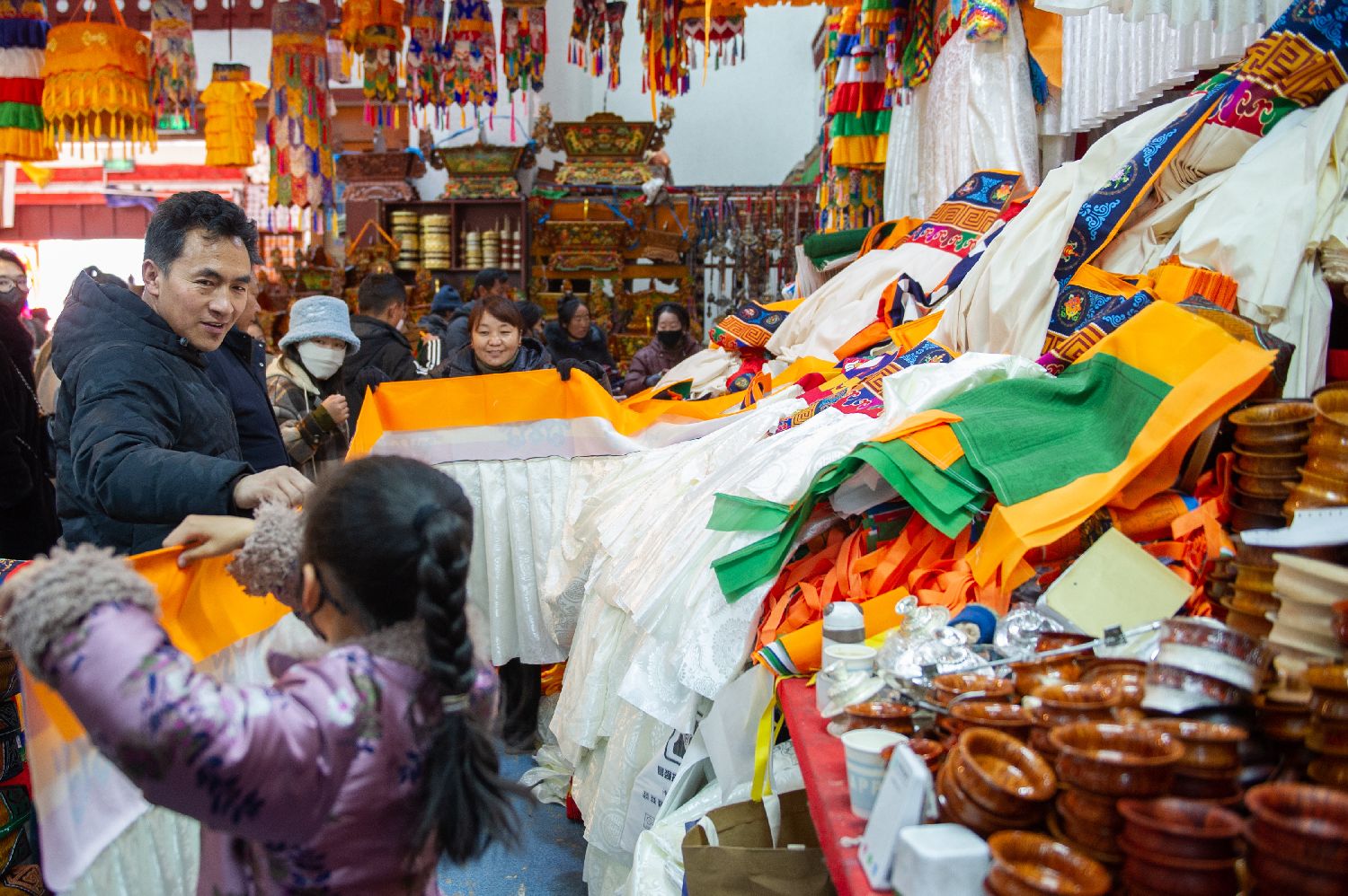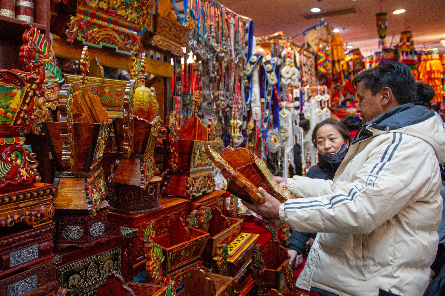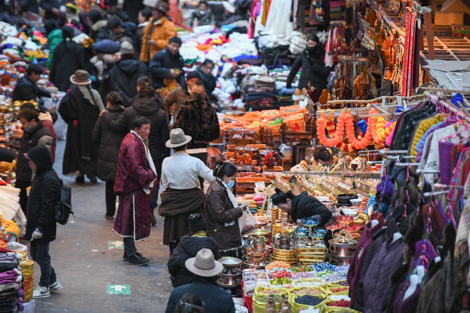 春节、藏历新年将至,西藏拉萨市八廓商城人头攒动、热闹非凡,前去采购年货的民众络绎不绝。图为1月23日,民众在八廓商城选购年货。(中新社)