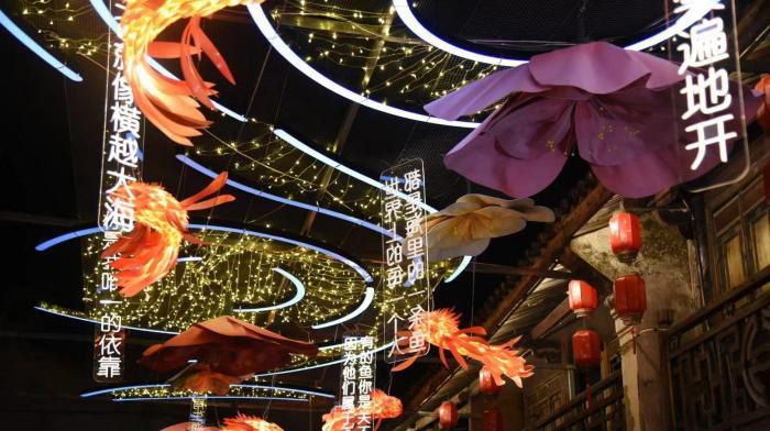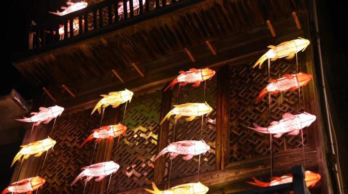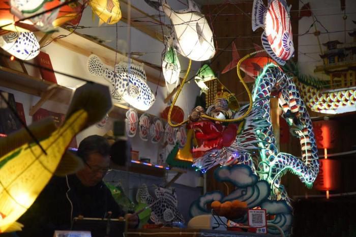 2月13日,农历大年初四,浙江宁波象山县石浦渔港古城张灯结彩,夜色迷人,吸引不少游人前来欣赏海洋特色的鱼灯。图为石浦渔港古城里的鱼灯。(中新网)