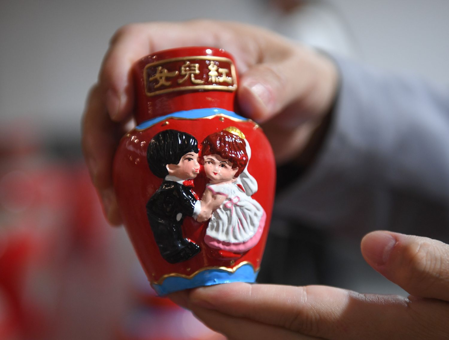 5月25日,浙江绍兴上虞,工作人员展示婚庆主题的绍兴黄酒产品。