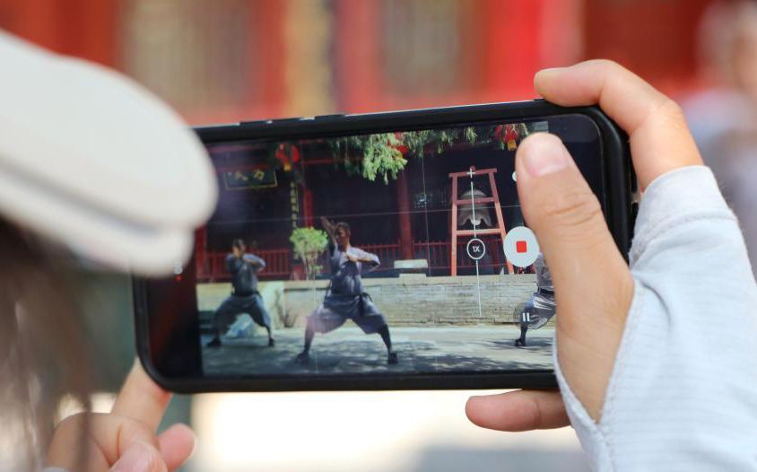少林寺功夫表演吸引海内外游客围观拍摄。(中新社)