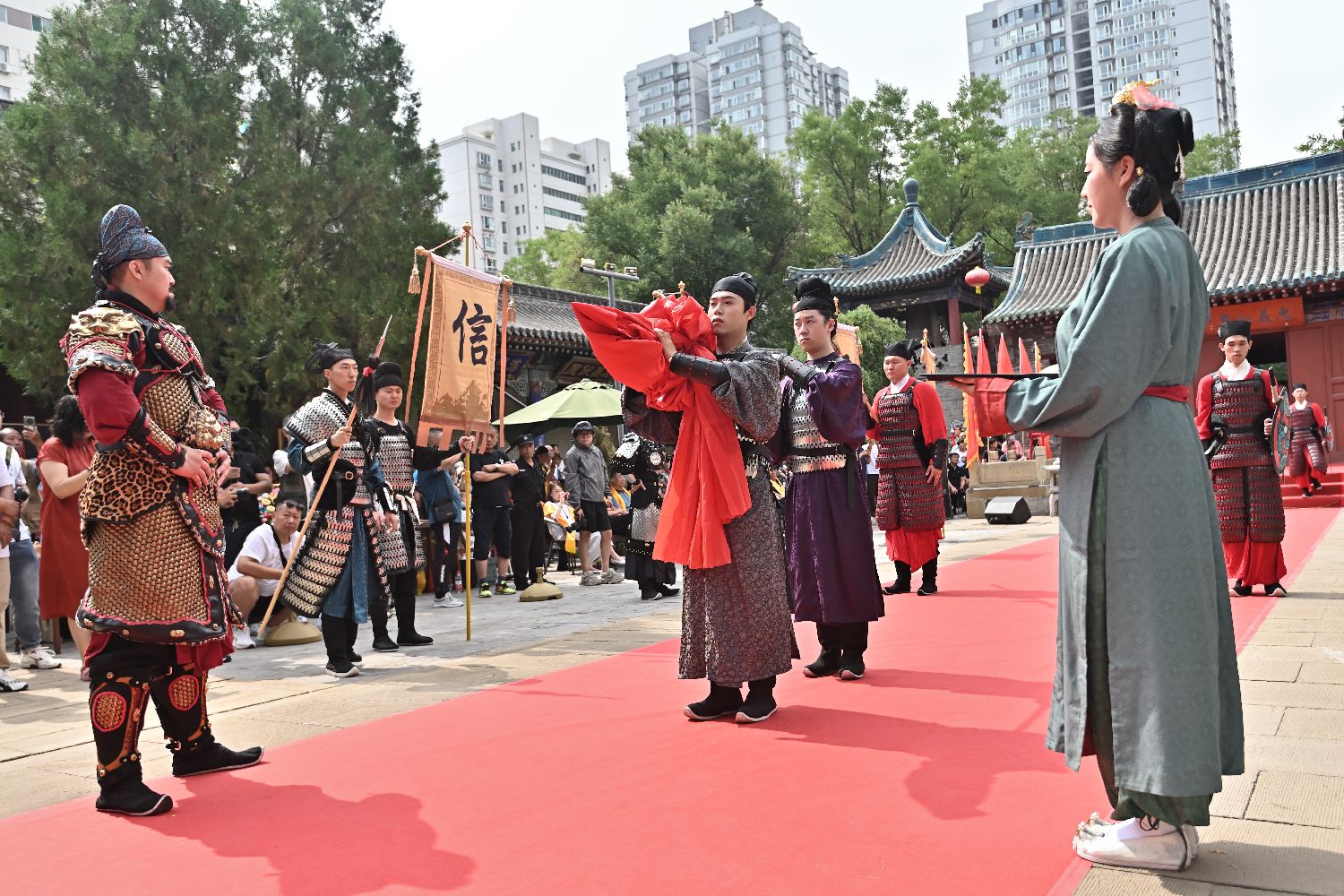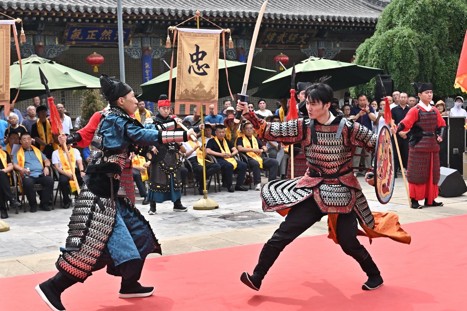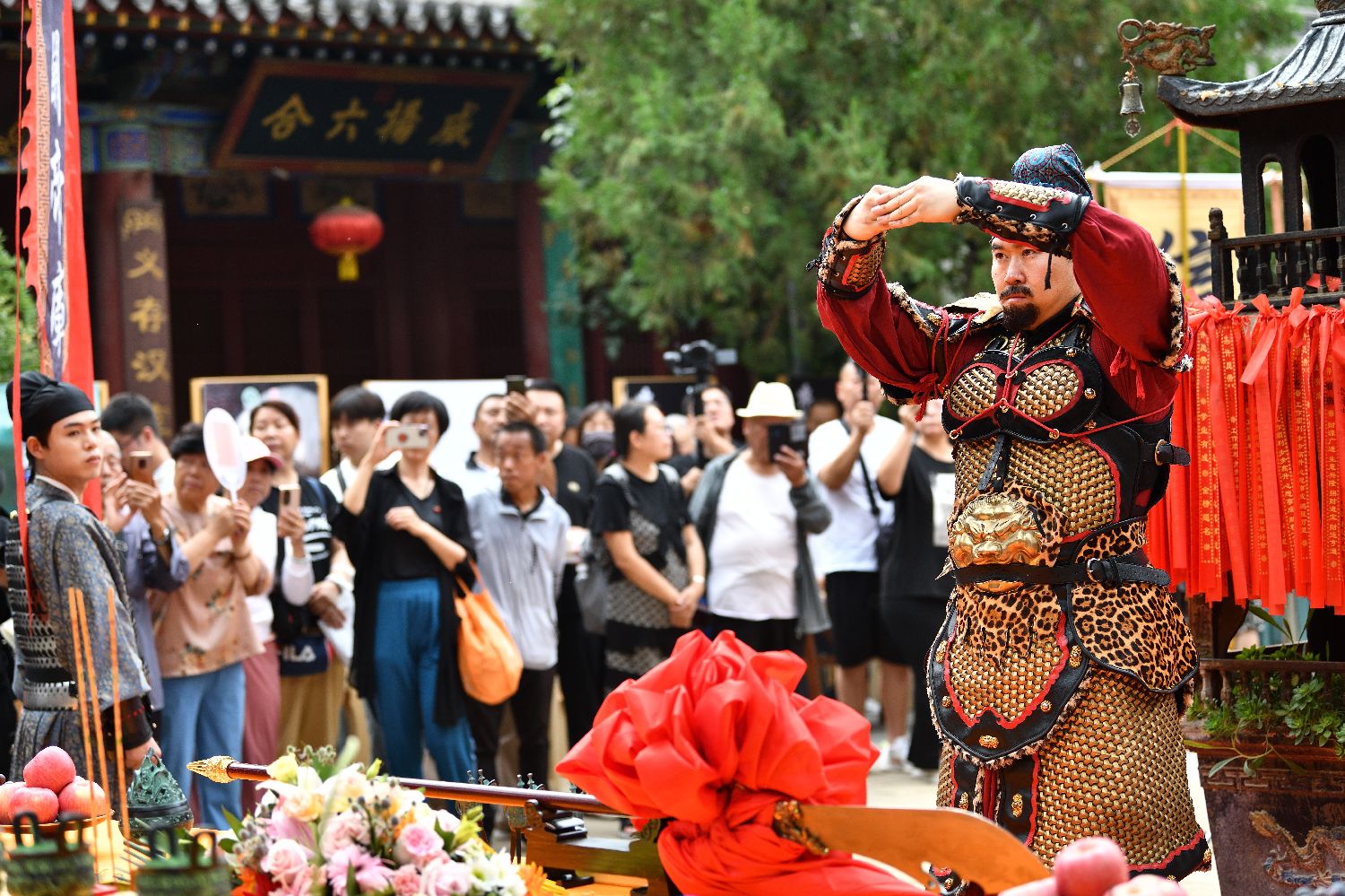 演员身披甲胄在大关帝庙进行武礼表演。(中新社)