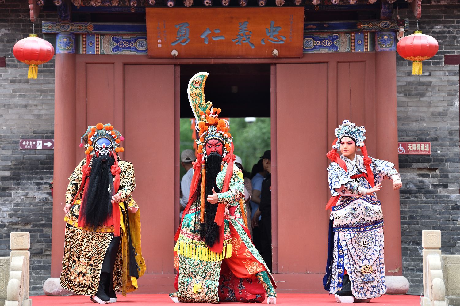 晋剧演员扮演关公在大关帝庙进行戏曲表演。(中新社)
