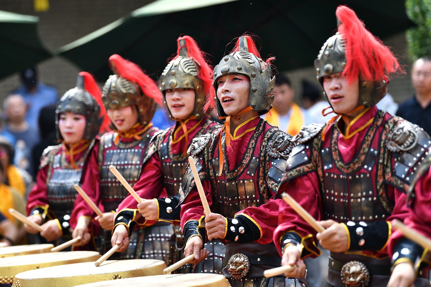 演员身披甲胄在大关帝庙进行鼓乐表演。(中新社)