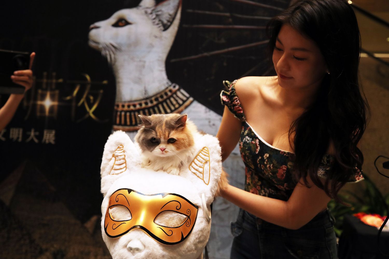 200只精心打扮的宠物猫在主人的带领下齐聚“金字塔之巅:古埃及文明大展”,开启奇妙的观展体验。图为活动现场宠物猫与主人合影。(中新社)
