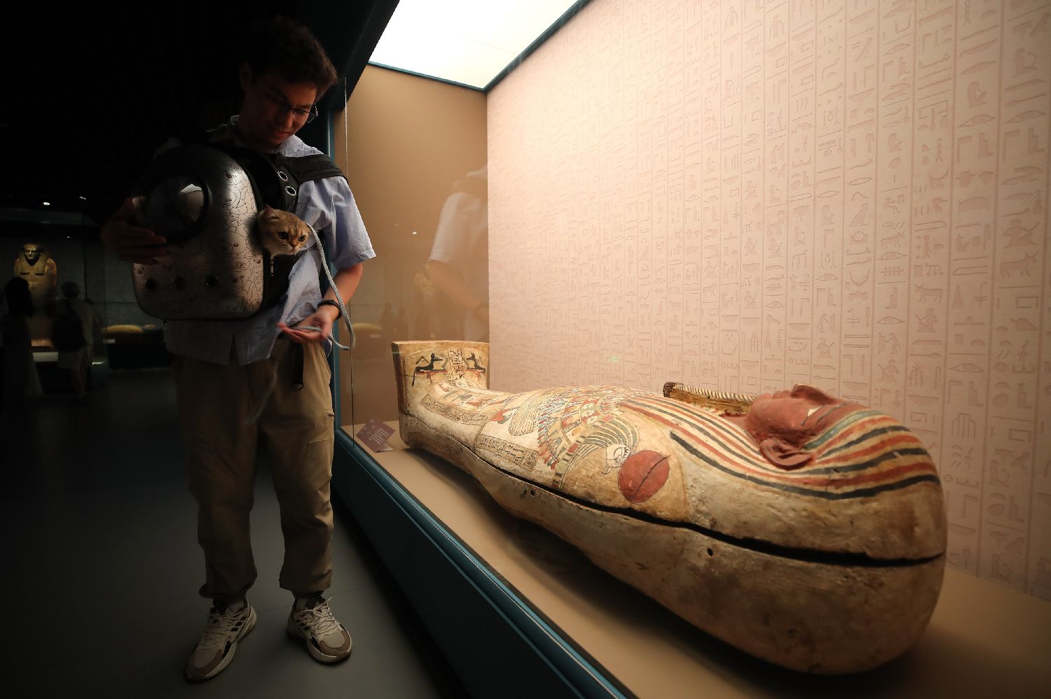 宠物猫从主人的怀抱里探出脑袋好奇的打量展出的木乃伊。(中新社)