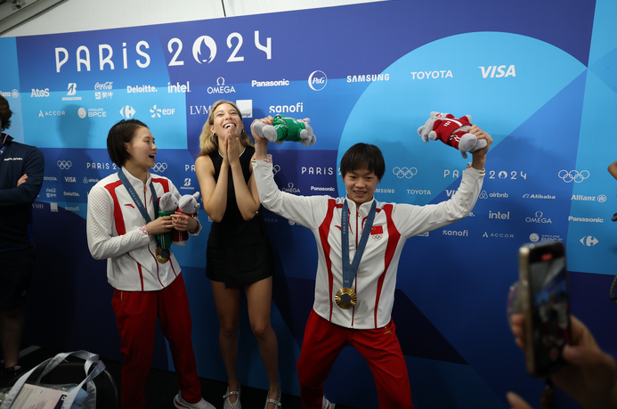 31日,在巴黎水上运动中心的新闻发布厅,坐在台上的女子双人10米台金牌得主全红婵忽然眼睛一亮,然后偷偷笑了起来。等到一旁的陈芋汐回答完记者提问,全红婵捂着嘴说起悄悄话,陈芋汐也朝台下笑了起来。