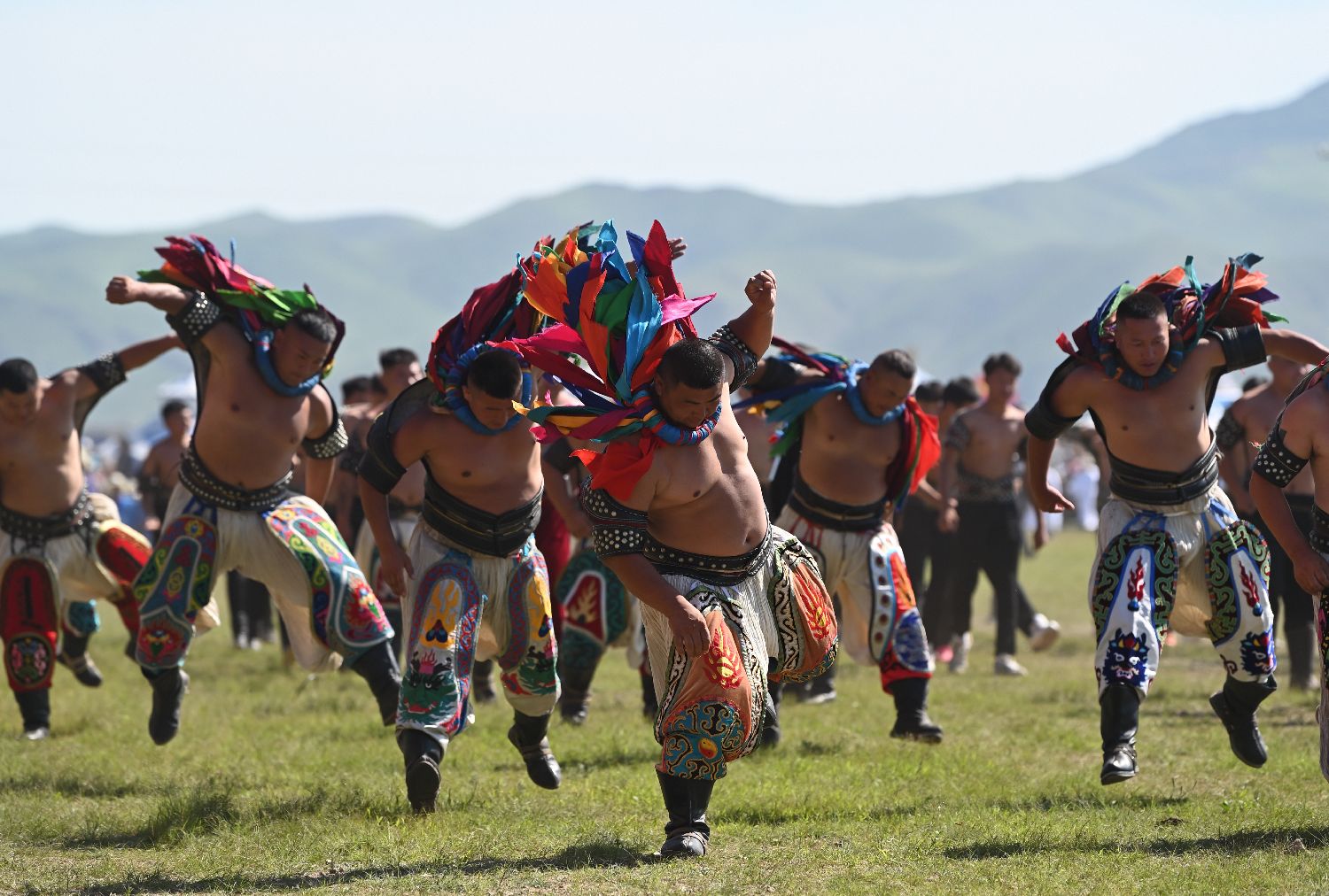 此次各项比赛中,成年男子搏克比赛的奖金最高,第一名为8万元人民币,这也吸引了512名选手踊跃参加。图为乌兰牧骑演员在开幕式表演舞蹈《哈啾嗨》。(中新社)