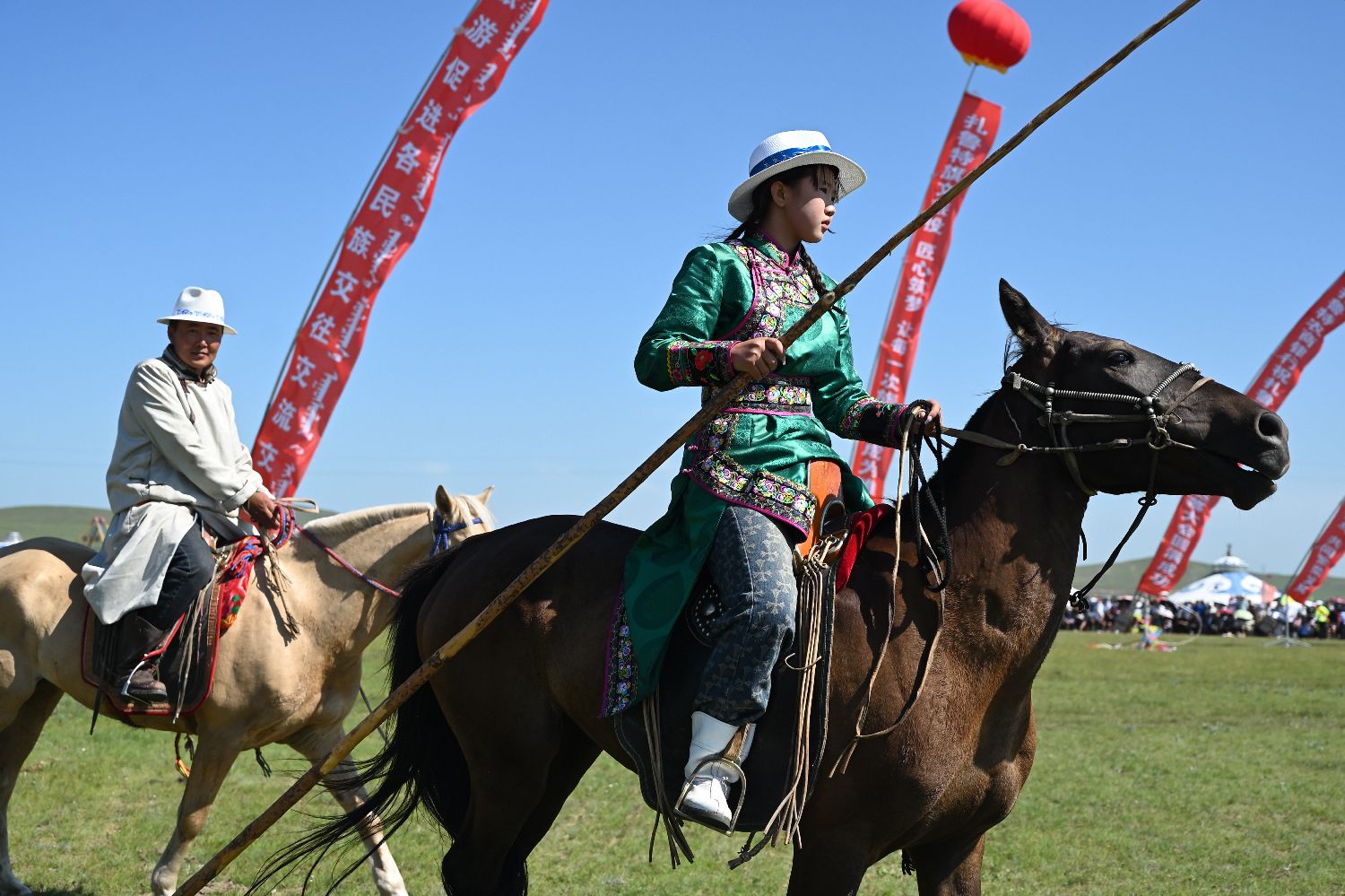 蒙古族小骑手拿着套马杆参加开幕式。(中新社)