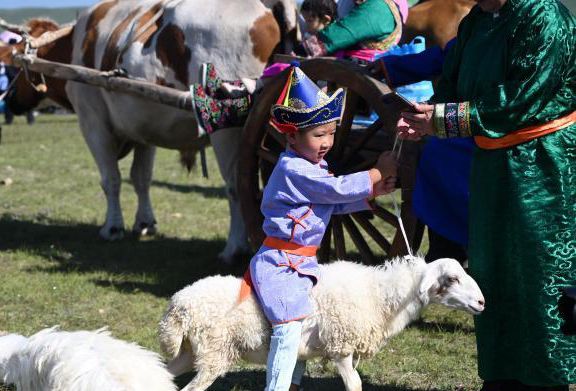 小朋友“骑羊”参加那达慕开幕式。(中新社)