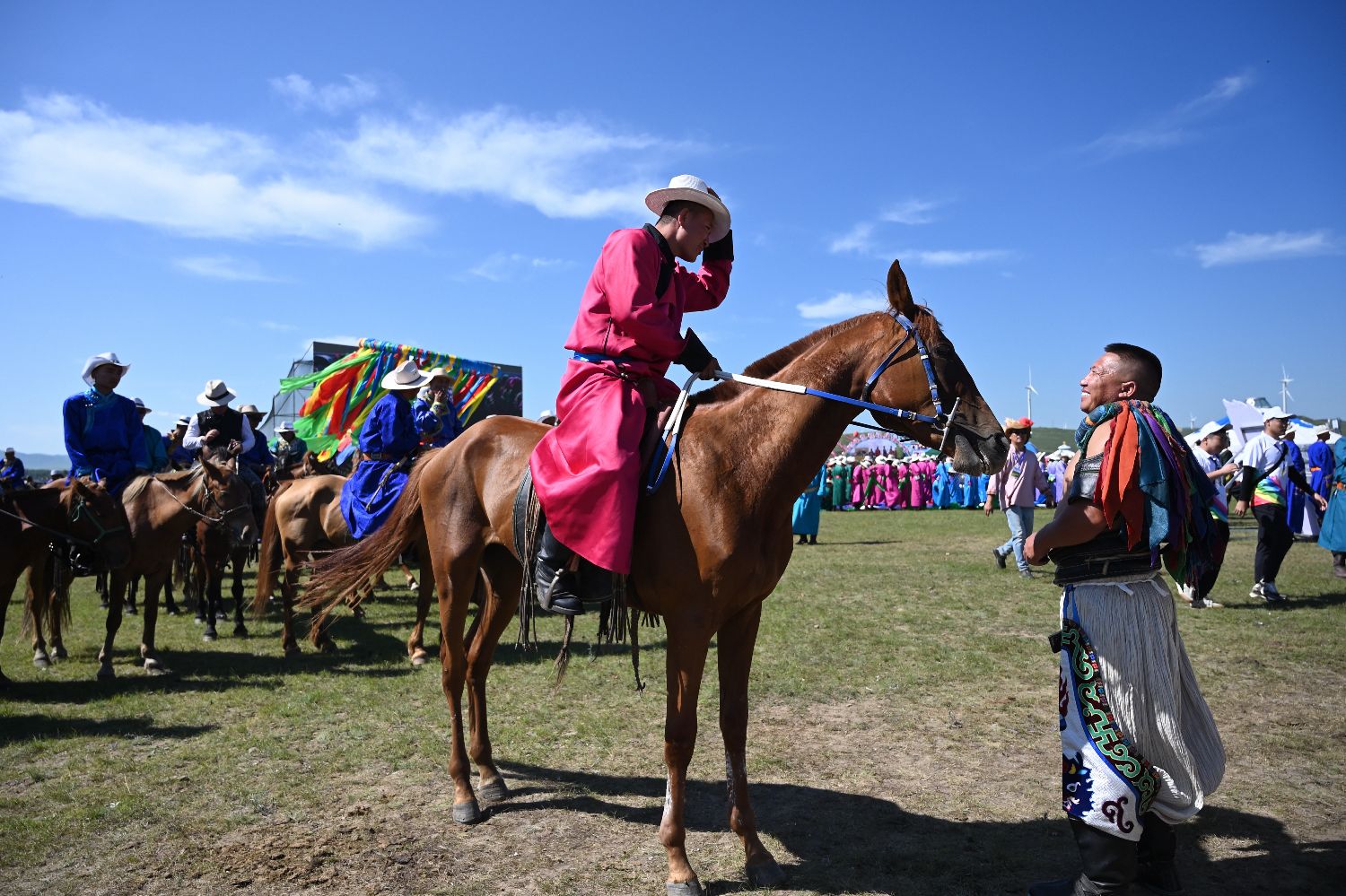 牧民与搏克手在那达慕上打招呼。(中新社)