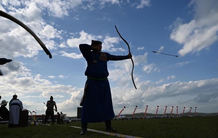牧民在蓝天白云下参加射箭比赛。(中新社)