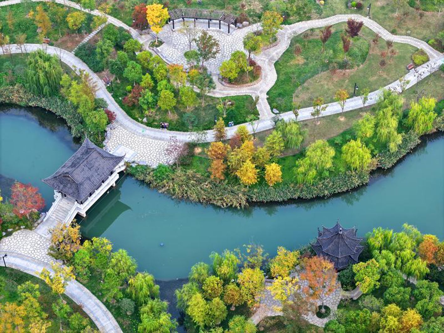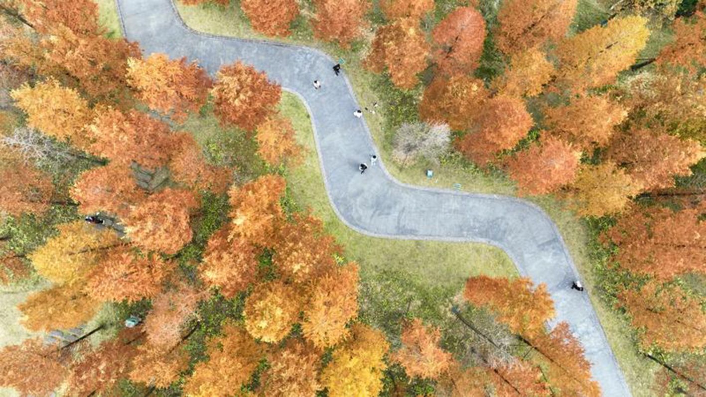 11月13日拍摄的浙江省杭州市上城区桃花湖公园(无人机照片)。初冬时节,寒风萧瑟,层林尽染,中国大地绘就出一幅幅苍茫辽阔、色彩斑斓的美丽画卷。(新华社)