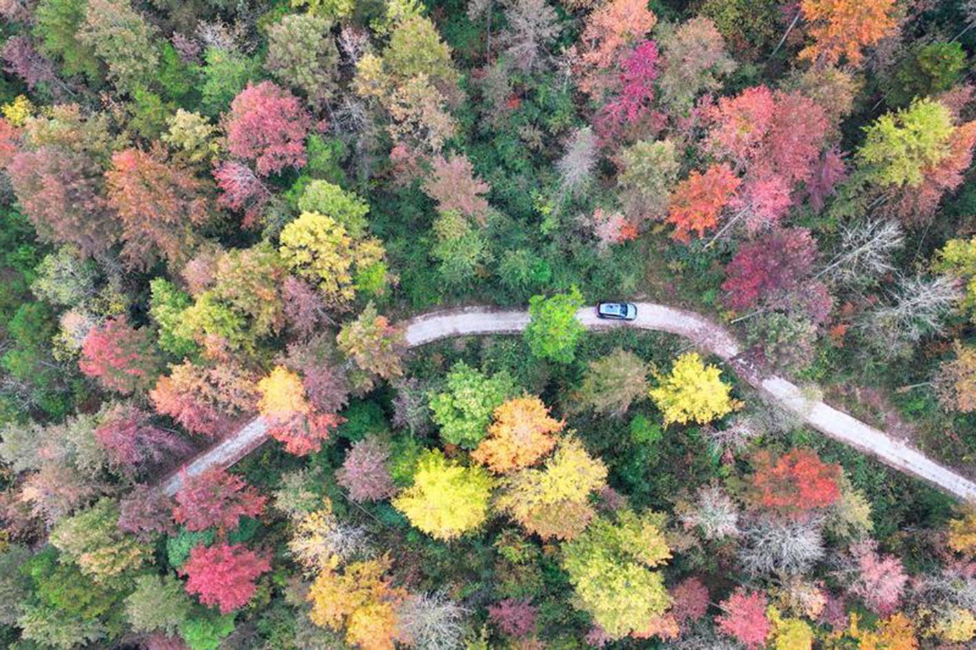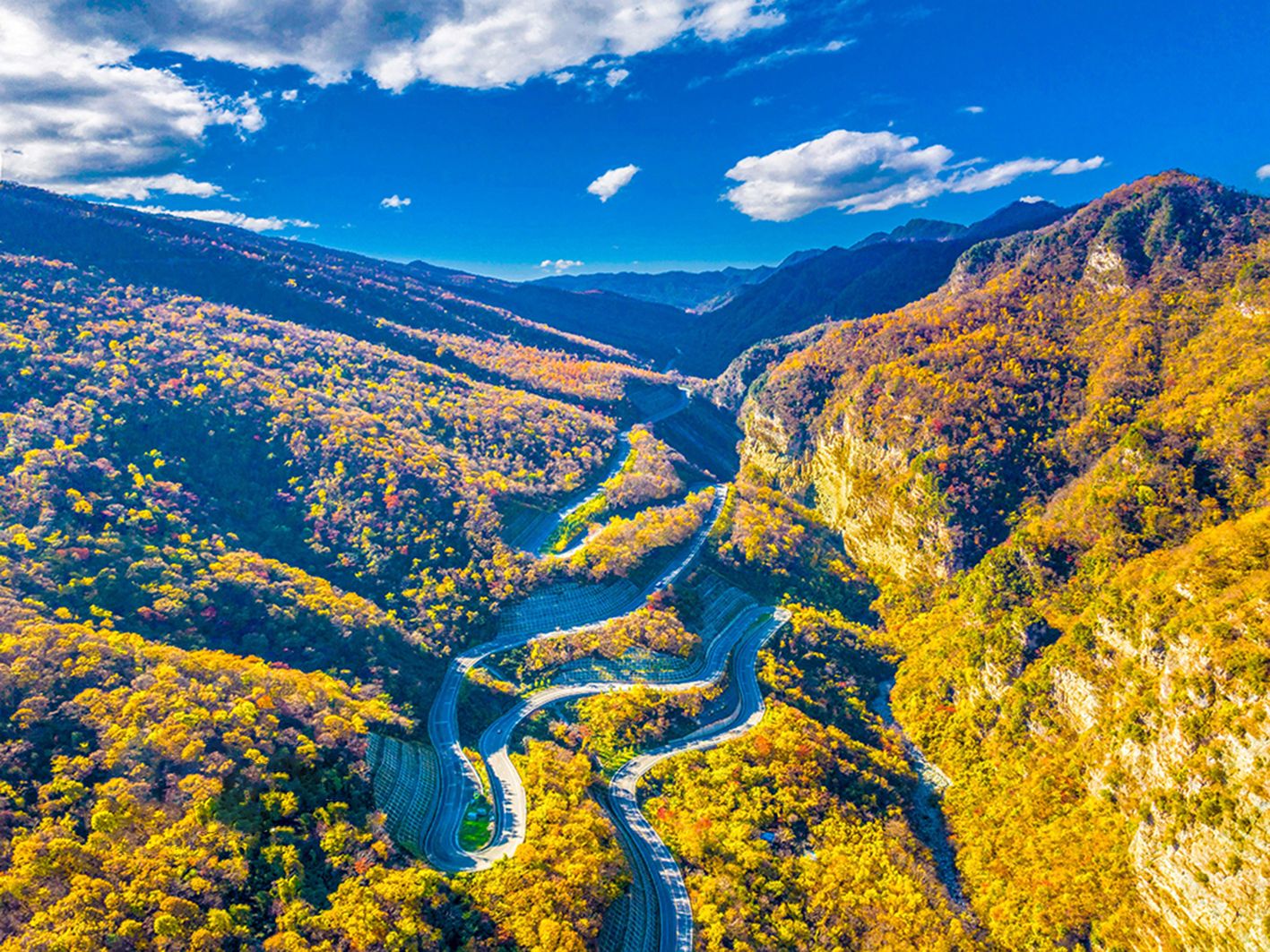 近日,湖北省十堰市房县“十回首”盘山公路两侧群山植被层林尽染,景美如画。(人民网)