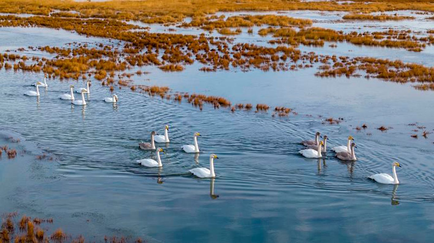 11月12日,甘肃省酒泉市阿克塞哈萨克族自治县阿伊纳乡,天鹅在小苏干湖游弋(无人机照片)。(新华社)