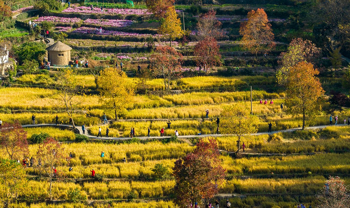 11月13日,初冬时节的黟县乡村如同一幅绚丽多彩的画卷徐徐展开,五彩斑斓的乌桕树与周围的村庄、田野、山川相互映衬,美若画卷。(人民网)