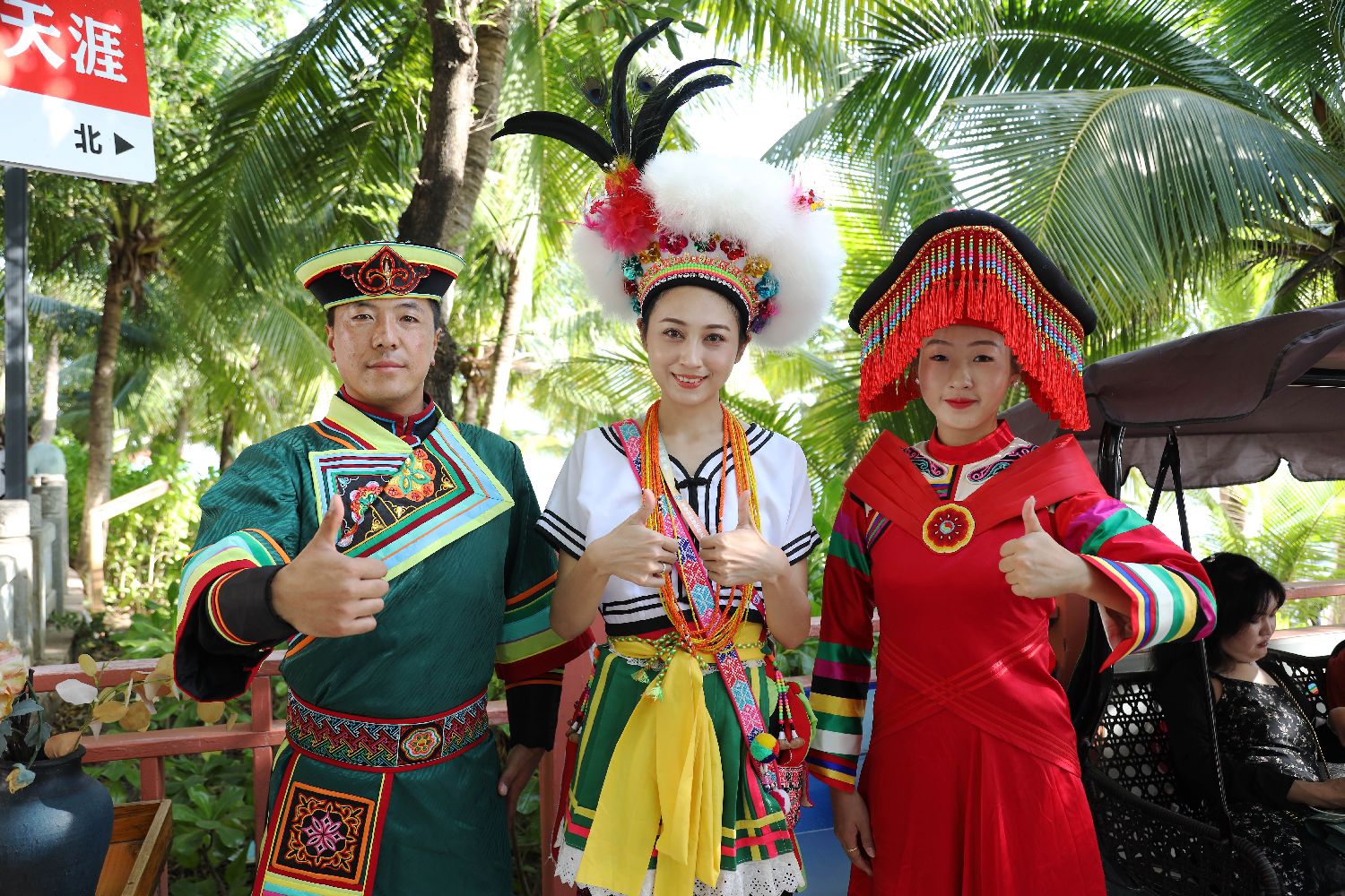 11月26日,海南三亚,参加第十二届全国少数民族传统体育运动会民族大联欢活动的陈海琳(中)与其他嘉宾合影。
