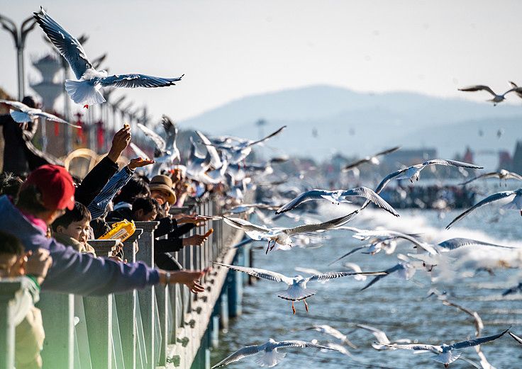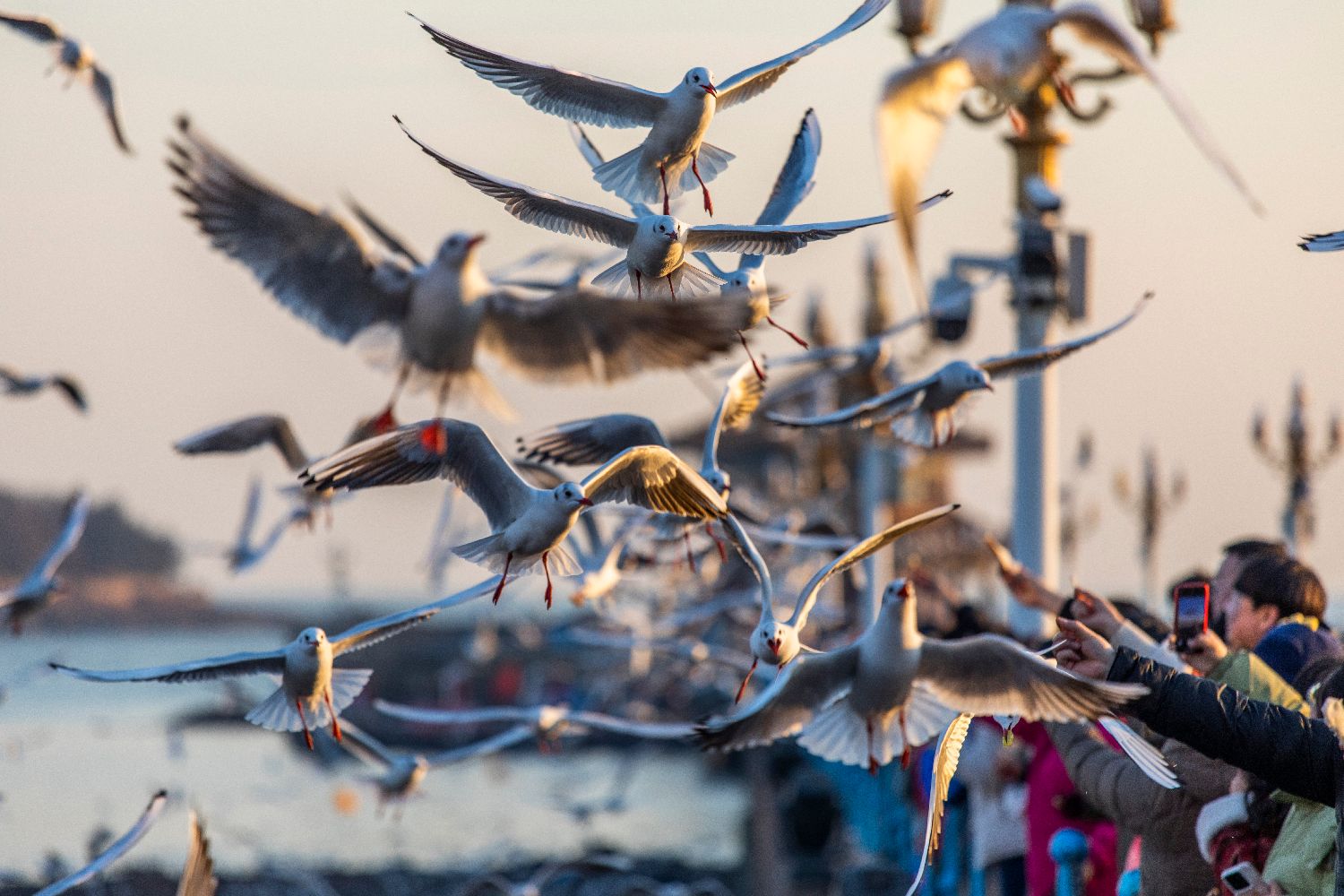 每年的12月至次年2月是中国的观鸥季,大批的红嘴鸥,银鸥,黑尾鸥陆续从西伯利亚地区,俄罗斯的贝加尔湖,中国的天山西部迁徙到天津、山东、云南等地过冬。随着数万只海鸥如期而至,在海面上空翻飞起舞,吸引着越来越多的游人专程前去“打卡”,随手一拍就是一张与“鸥”同框的人生照片。