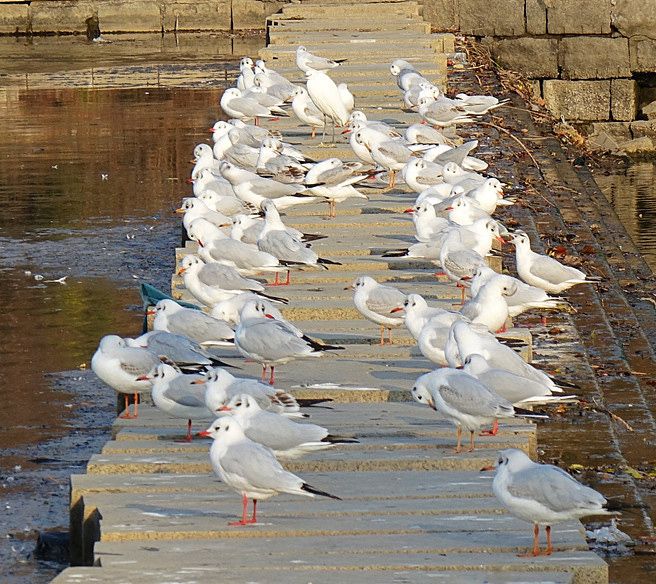 12月17日,山东青岛西海岸新区唐岛湾海滨,成群海鸥时而歇息,时而飞舞,呈现冬日灵动美景。图为步道成海鸥乐园,海鸥们整齐“排排坐”十分可爱。(CFP)