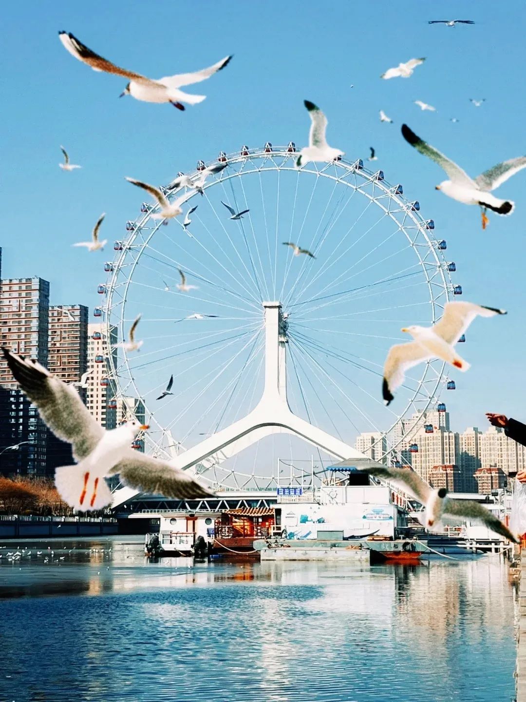 图为天津之眼与盘旋河面的海鸥们组成的浪漫一刻。(天津发布微信公众号)