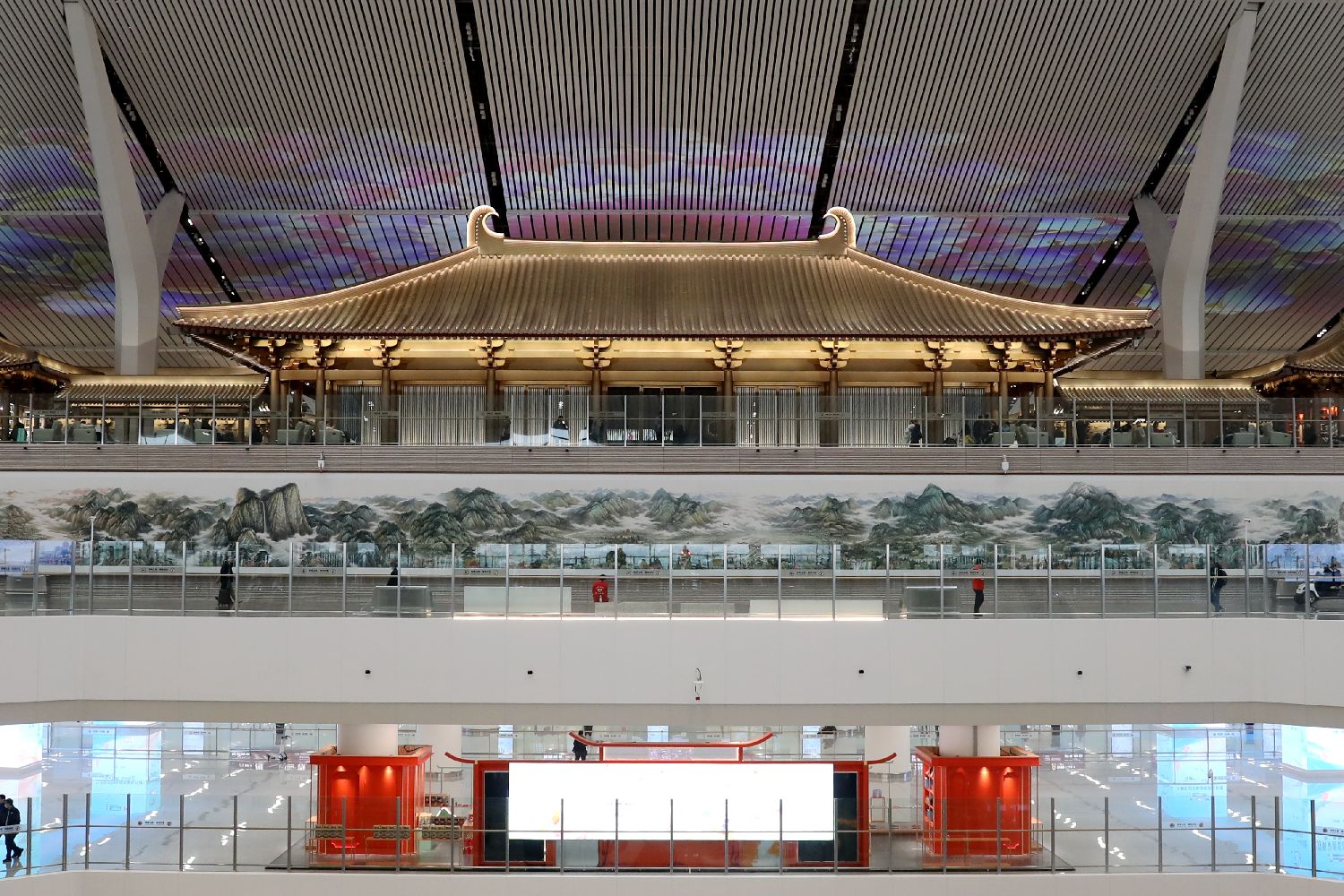 2月20日,陕西西安,西安咸阳国际机场T5航站楼正式投入运营。作为中国首座以“T5”命名的航站楼,其总建筑面积达70.55万平方米,超过西安咸阳国际机场现有T1、T2、T3航站楼的总和。T5航站楼采用“双层出发、双层到达”的客流组织模式,能够实现国际以及中国国内始发旅客同层出发,无需转换楼层,大幅提升通行效率。此外,全球首个设置在机场内的在地文物展示博物馆也正式揭牌。其中珍宝馆展出了国家一级文物“秦公镈”,四方馆为基本陈列展览,展品以机场历次建设过程中考古发掘的相关文物为主。图为T5航站楼内部。(中新社)