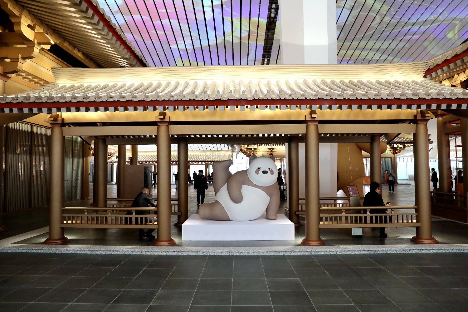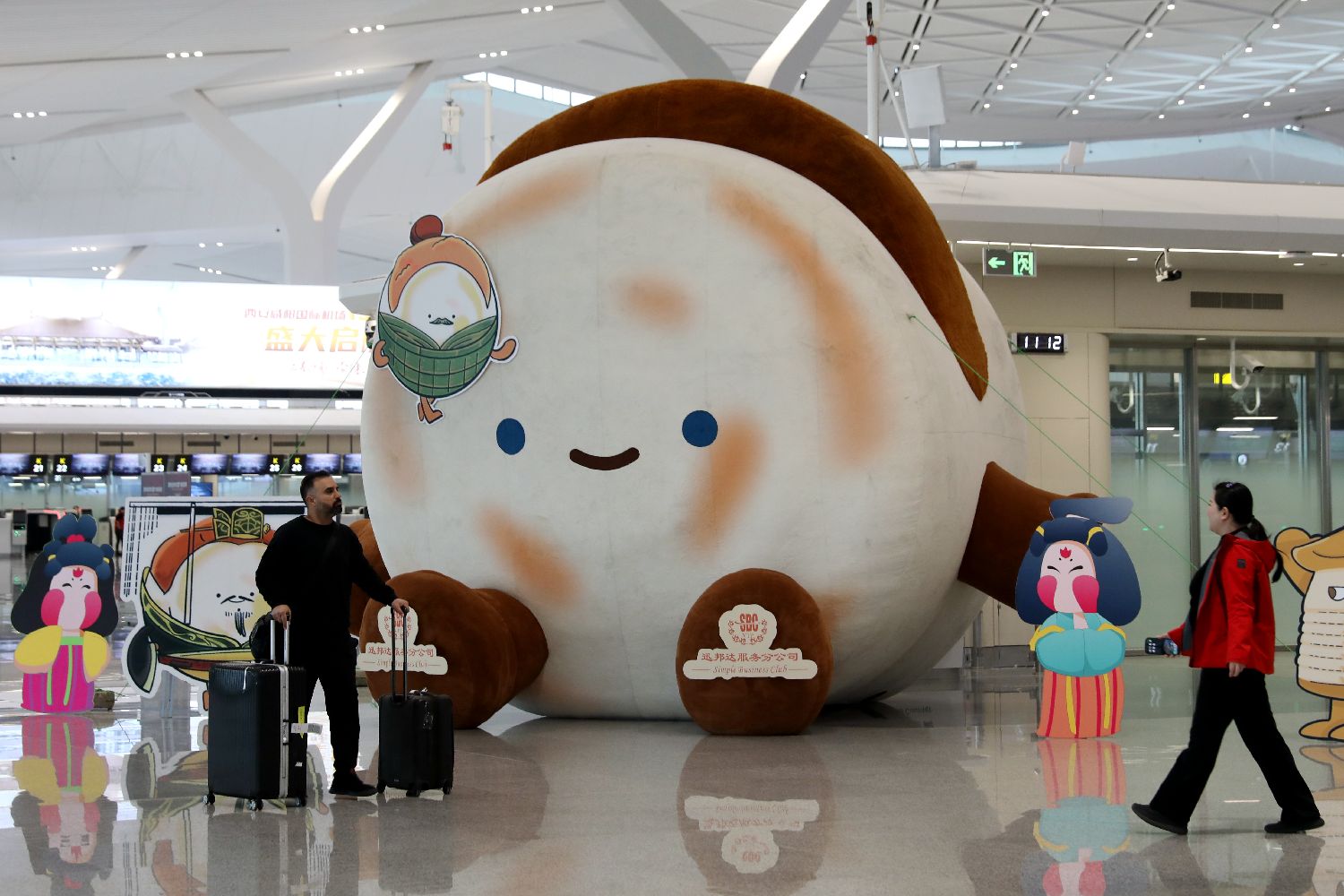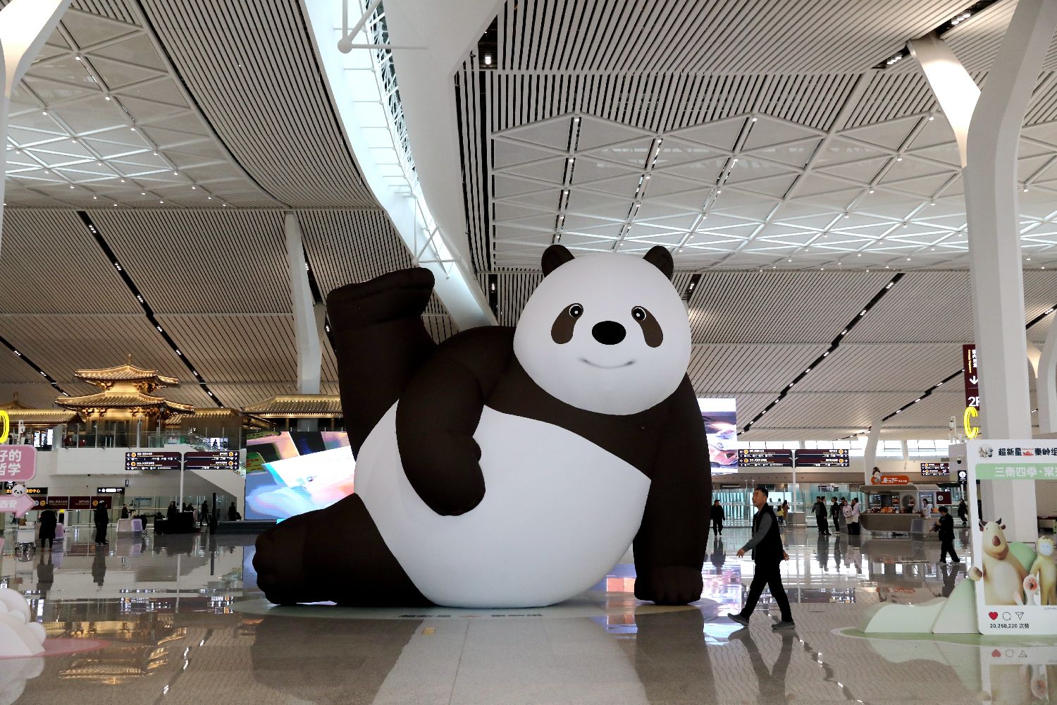 图为T5航站楼内的巨型大熊猫吉祥物。(中新社)