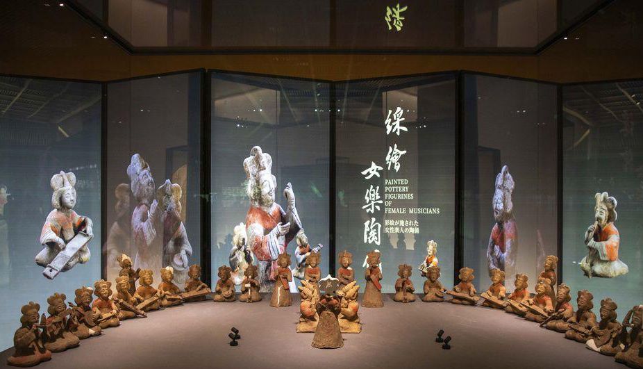 图为机场博物馆展出的文物:彩绘陶女乐俑(十六国)。(陕西西部网)