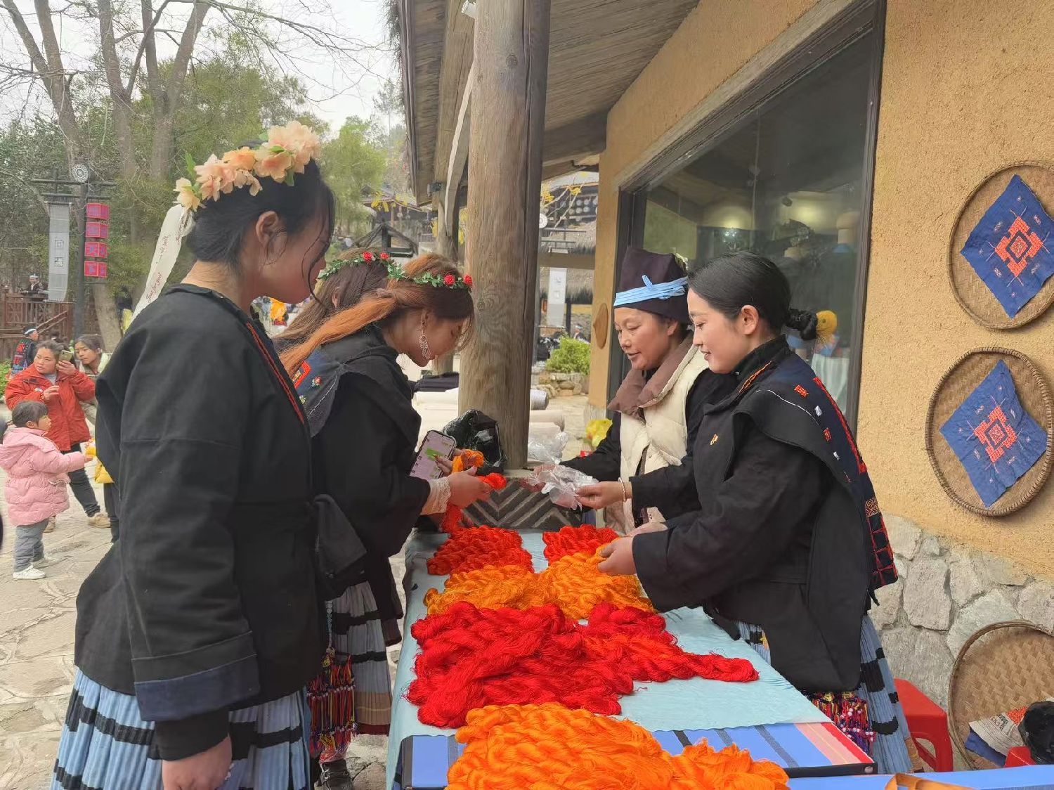 2月13日,“瑶族服饰”广西区级代表性传承人黎凤珍(右二)与女儿黎秋亿(右一)为游客介绍瑶族服饰所用的纱线。