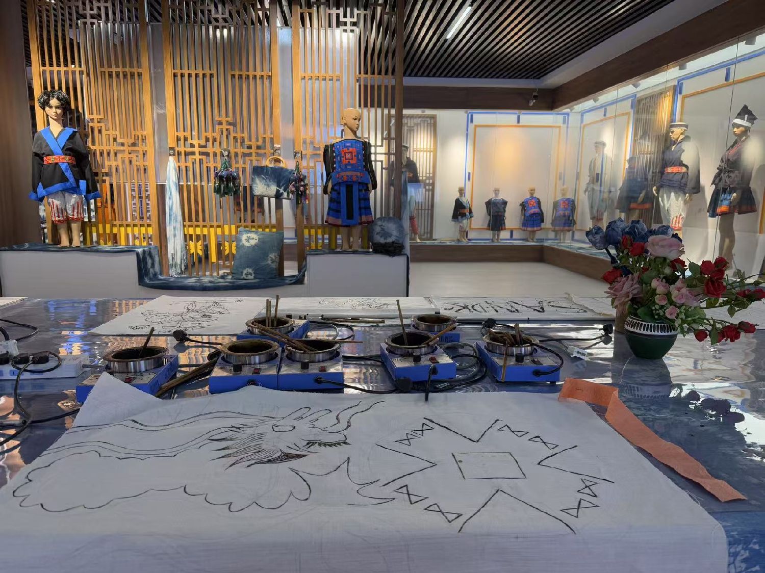 走进白裤瑶服饰展示厅,一幅幅粘膏画布陈列在桌上。黎秋亿表示,待用蓝靛上色、晾洗,再将粘膏煮掉,学员们的粘膏作品就完成了。“在玩中感受非遗,了解非遗,更能激发对非遗的兴趣。”