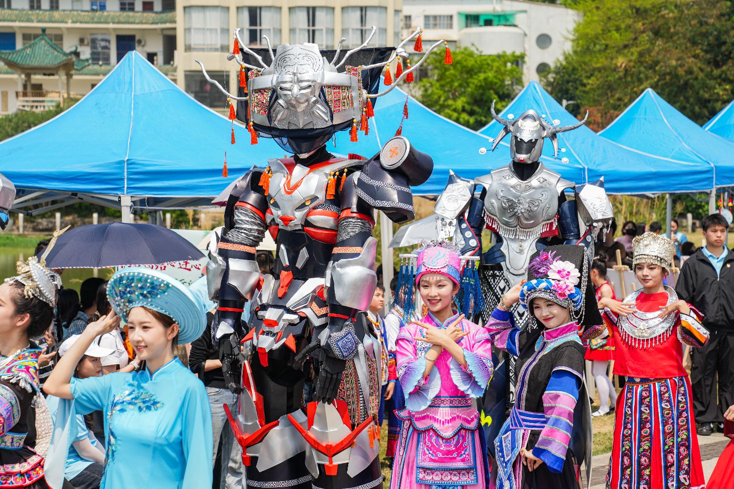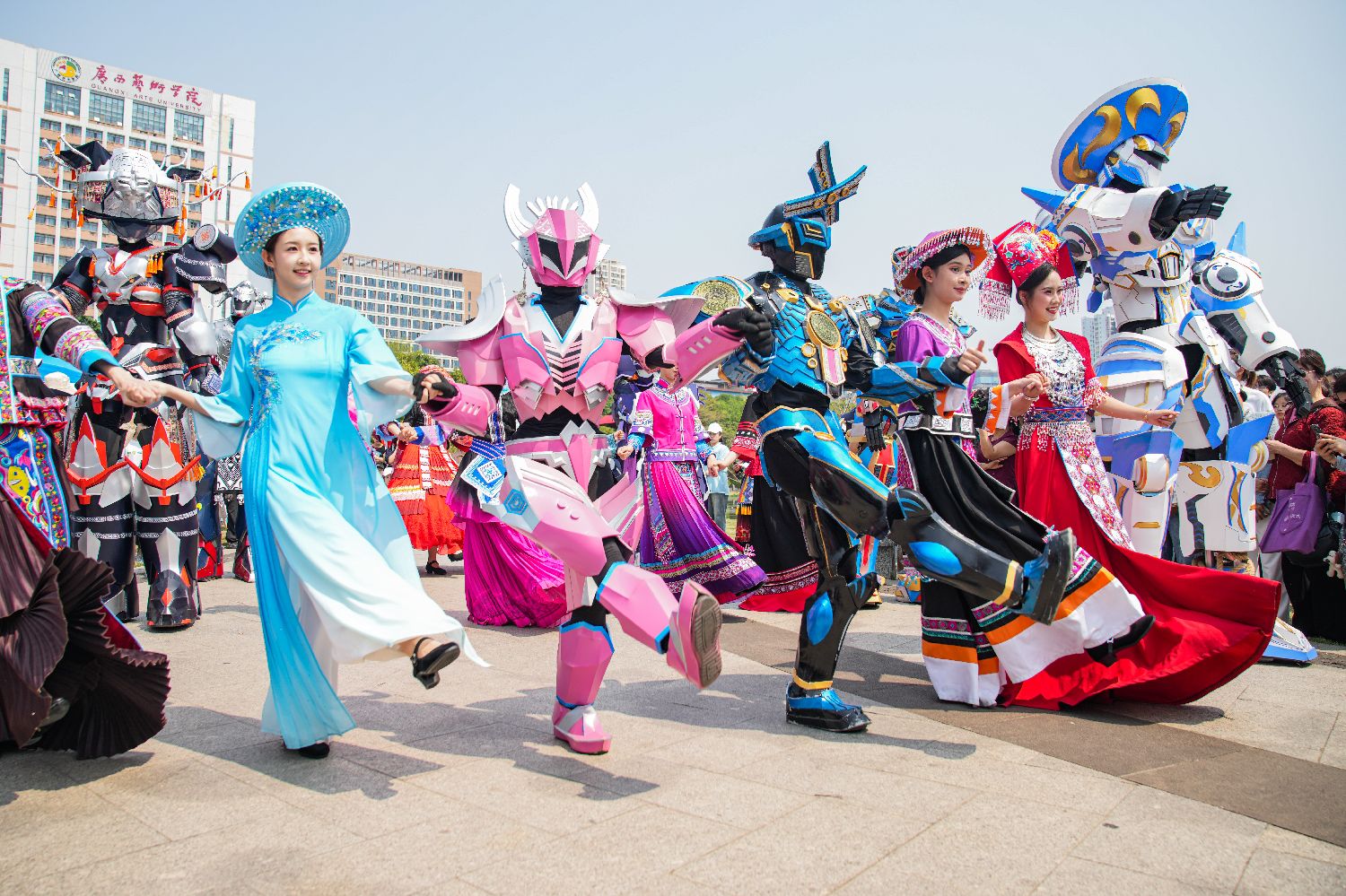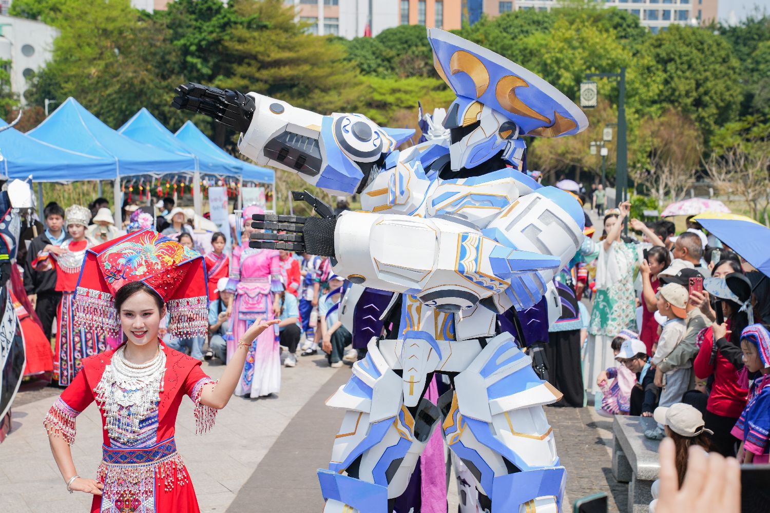 3月27日,由广西艺术学院校友带来的几款“广西三月三”主题“民族机甲”在广西南宁南湖公园亮相,吸引全场目光。图为京族机甲“踏浪”与模特进行《机甲织梦·锦绣八桂》之机甲双人舞表演。(中新社)