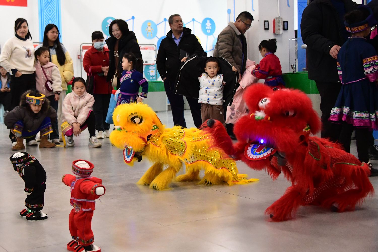 3月31日,广西河池市罗城仫佬族自治县在科技馆内举办“潮聚三月三,科普仫佬山乡”活动,将传统文化与现代科技完美融合,吸引众多居民前来观看,体验一场别开生面的“三月三”盛宴。图为人们在观看机器人和机器狗表演。(中新图片)