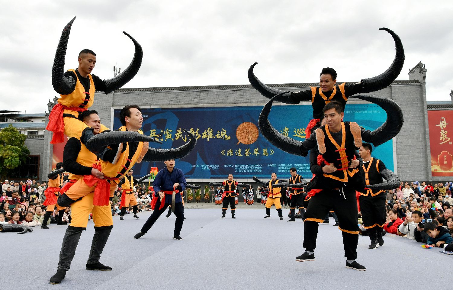 3月30日,以“非遗荟萃”为主题的“广西三月三·河池嘉年华””暨“狼兵演武彰雄魂 非遗巡展秀华裳”巡游展演活动在广西南丹县举行,展现了壮族铜鼓习俗、双人板鞋打扁担,白裤瑶吹牛角和竹蒿龙等非遗项目,每一项都承载着南丹人民的历史记忆和文化智慧。南丹县是国家级铜鼓文化(河池)生态保护区核心区,孕育了瑶族服饰、壮族蚂拐节、壮族铜鼓习俗、铜鼓舞(南丹勤泽格拉)等国家级非遗项目,在广西各族人民喜迎传统佳节“三月三”的时候,可以全面领略南丹非遗的独特魅力。图为3月30日,广西南丹县在丹泉广场非遗展演《斗牛斗》。(中新图片)