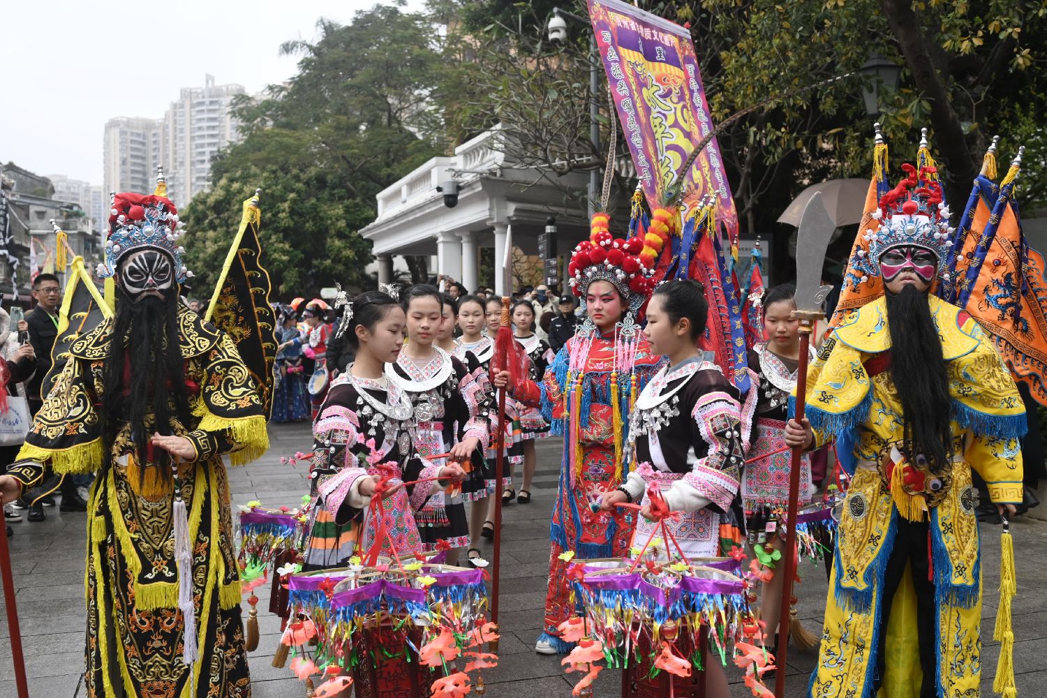 3月31日,广州市荔湾区,第十五届“荔枝湾·新西关”民俗文化活动之“三月三·荔枝湾”——上巳春归 北帝诞 长桌宴在荔枝湾景区拉开帷幕。图为贵州少数民族同胞带来表演。(中新图片)