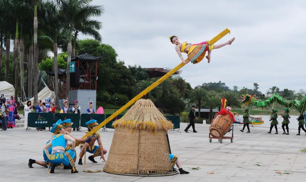 3月29日,演员在广西南宁园博园表演打磨秋,喜迎“三月三”传统佳节。(新华社)