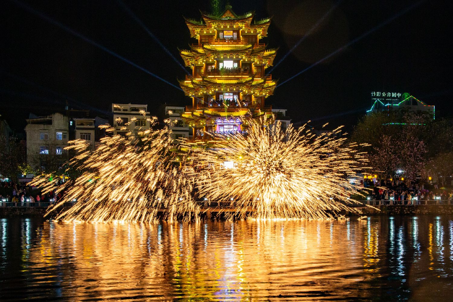 3月29日晚,广西梧州市蒙山县在长寿阁亲水平台举行“非遗铁花·闪耀永安”非遗项目打铁花表演,为市民与游客送上一场视觉盛宴。打铁花表演是该县“广西三月三·八桂嘉年华 ”文化旅游节庆系列活动之一。(中新图片)