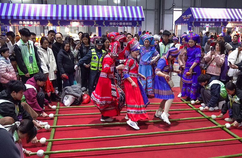 3月30日,广东东莞,广西三月三湾区嘉年华,老乡们身穿民族服装一起跳竹竿舞。(CFP)