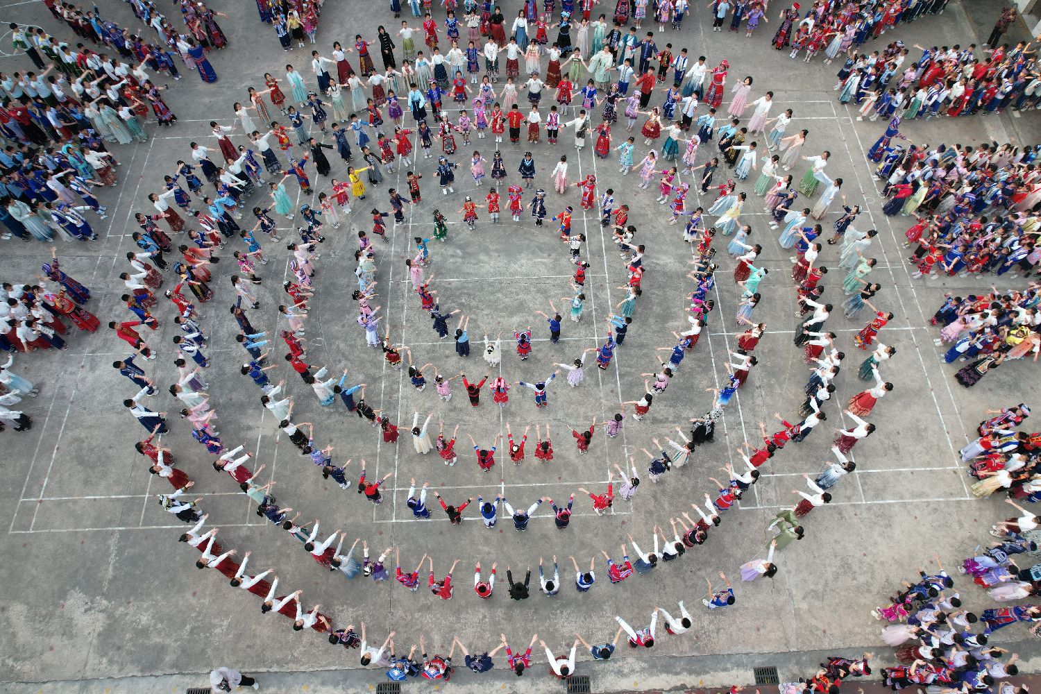 3月27日,广西南宁市菠萝岭小学开展一系列民俗体验活动。活动中,该校千名师生共跳民族舞蹈竹竿舞,喜迎“广西三月三”。(中新社)