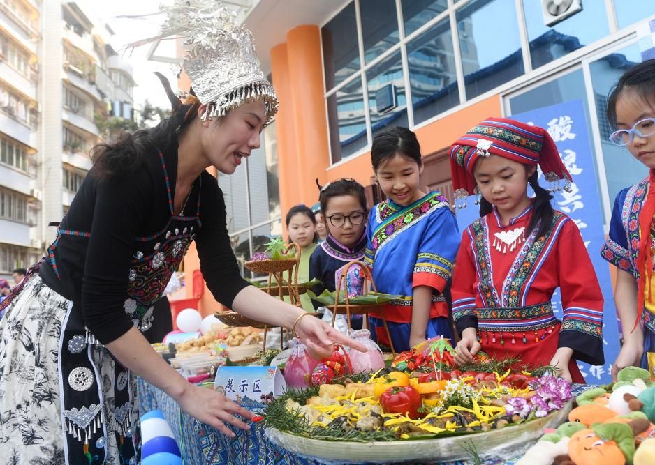 3月27日,在广西南宁市滨湖路小学,老师和学生共同展示美食。当日,广西南宁市滨湖路小学举办“石榴花开三月三 籽籽同心向未来”活动,通过唱歌、跳舞、美食展示等丰富多彩的活动,迎接传统节日“三月三”的到来。(新华社)