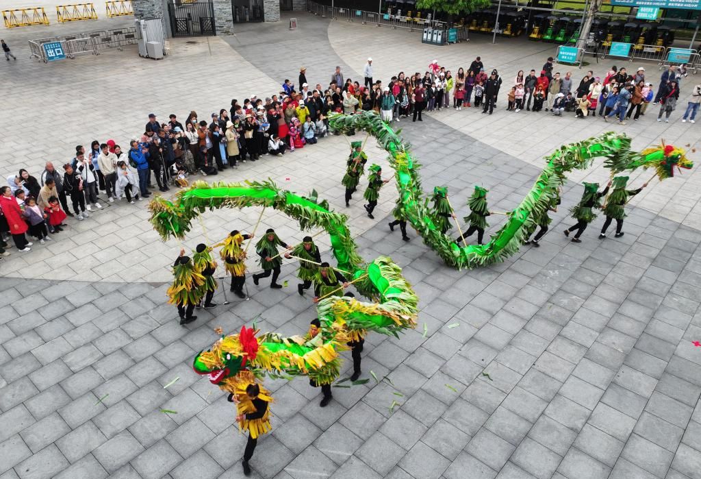 3月29日,演员在广西南宁园博园舞芭蕉香火龙,喜迎“三月三”传统佳节。(新华社)