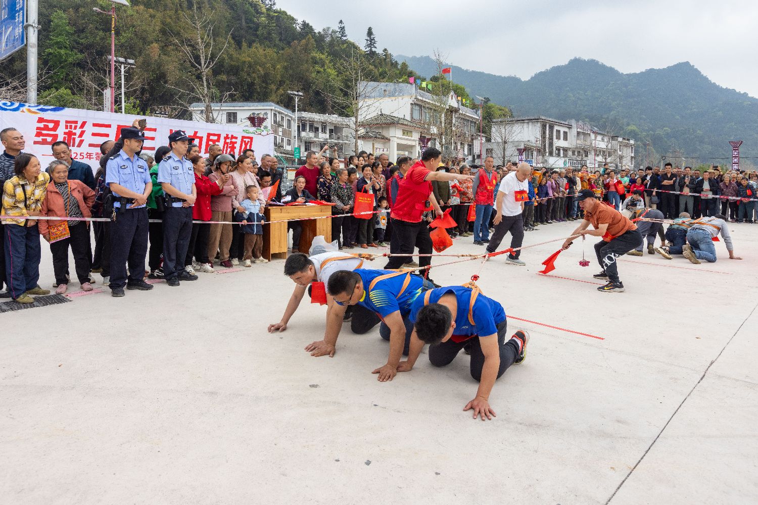 3月27日,广西梧州市蒙山县夏宜瑶族乡举办少数民族传统体育竞技比赛活动,迎接广西三月三的到来。比赛设拔河、滚铁环、3人板鞋竞速、大象拔河、抛绣球等5个项目。共有乡政府、乡直单位、县直共建单位、各村代表队150名运动员参赛。图为大象拔河比赛。(中新图片)