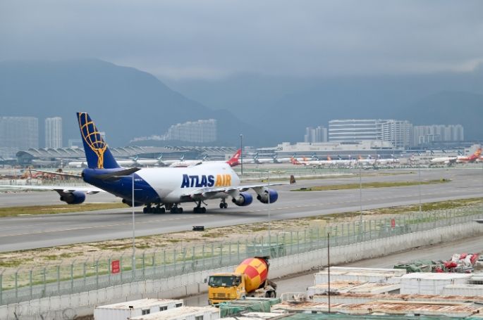 资料图:2022年11月美国一货运飞机降落香港国际机场后滑行。