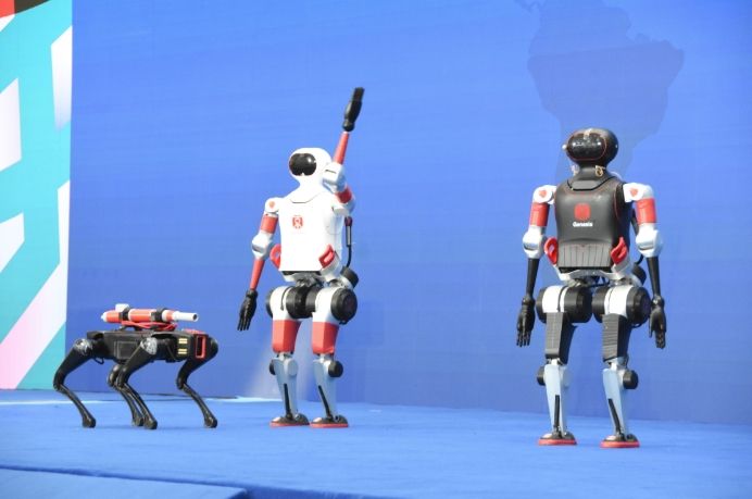 4月20日,在河南安阳举行的2025中国(安阳)国际汉字大会上,AI机器人“武丁”“妇好”携带机器狗亮相。