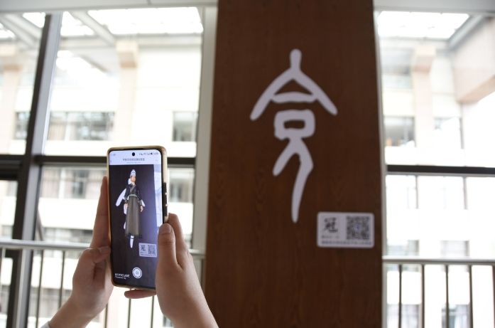 4月21日,在河南安阳师范学院甲骨文信息处理教育部重点实验室,工作人员演示基于增强现实技术的甲骨字展示与活化小程序。