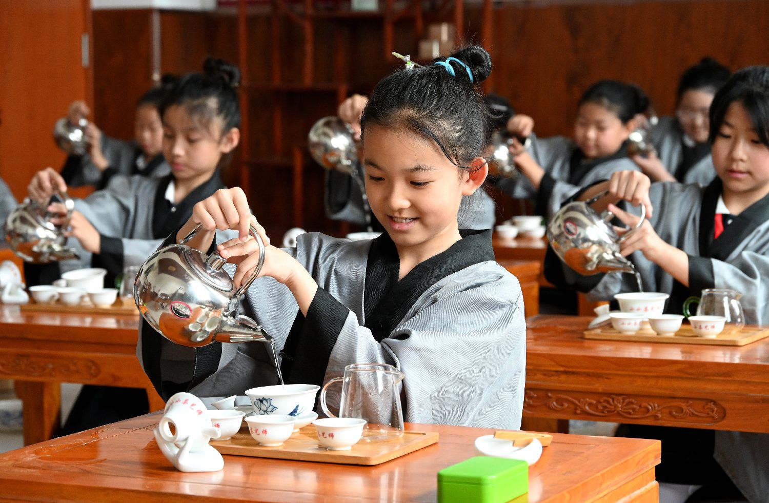 2025年5月21日是第六个“国际茶日”,全球多地飘散茶香、共庆茶文化。从联合国“舞台”到中国民间茶席,从千年古茶到创新技艺,中国茶正以多元姿态连接世界,向世界传递“茶和天下”的东方智慧。图为5月21日,河北省邯郸市丛台区春光小学的学生在茶艺室学习茶艺。当日,中国河北省邯郸市丛台区春光小学开展“茶香茶韵润童年”活动,小学生们在茶艺师的指导下学习茶艺,让学生们从小感受中国传统茶文化的魅力,感受茶艺之美。(中新图片)