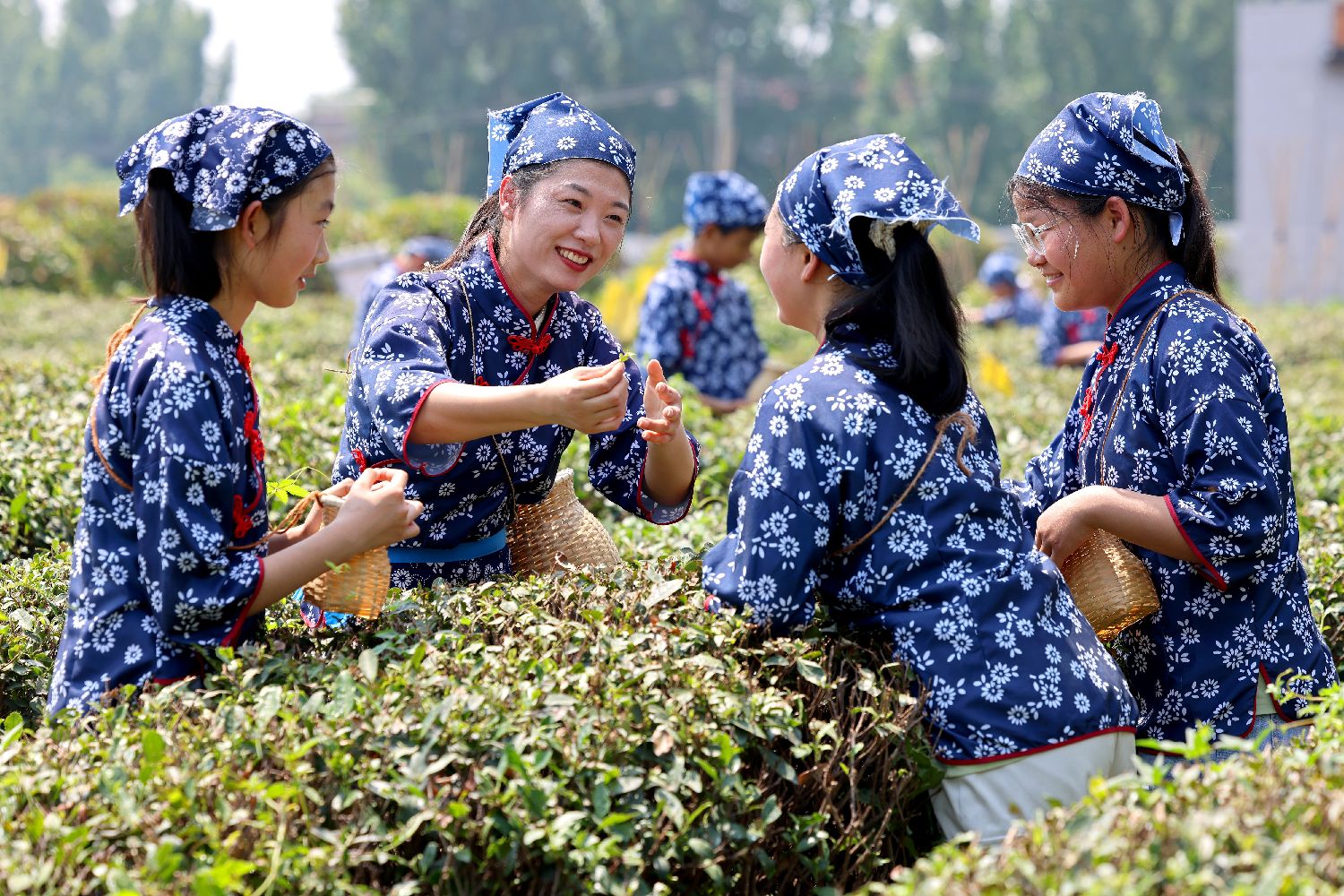 5月21日,中国山东省枣庄市市中区孟庄镇大郭庄村茶园开展丰富多彩的茶文化活动,吸引众多小学生前来体验采茶、学习茶艺等,感受茶文化的独特魅力。图为茶农(左二)向前来参加研学活动的小学生们传授采茶方法。(中新图片)