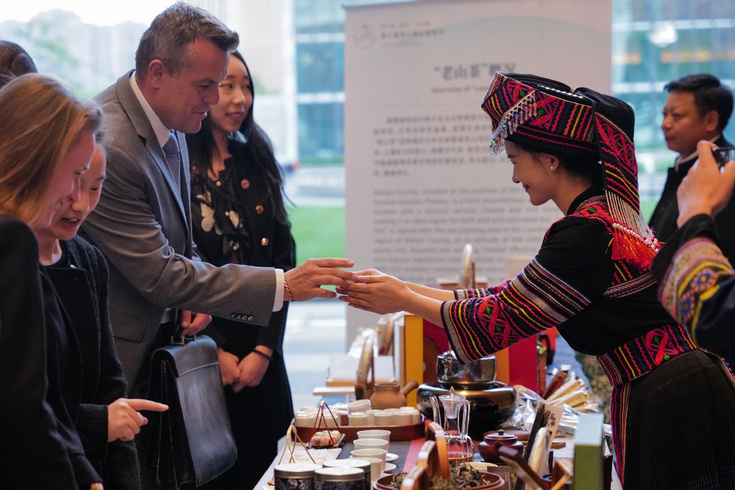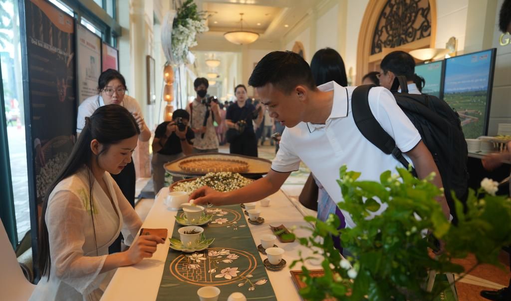 5月21日,来宾在越南首都河内举办的推介活动上了解茉莉花茶。正值“国际茶日”,“茶和天下·雅集”暨胡志明足迹中越友谊广西红色旅游线路推介活动21日在越南首都河内举办,以茶为媒促进文明交流互鉴,传承中越传统友谊,深化桂越人文交流与旅游合作。(新华社)