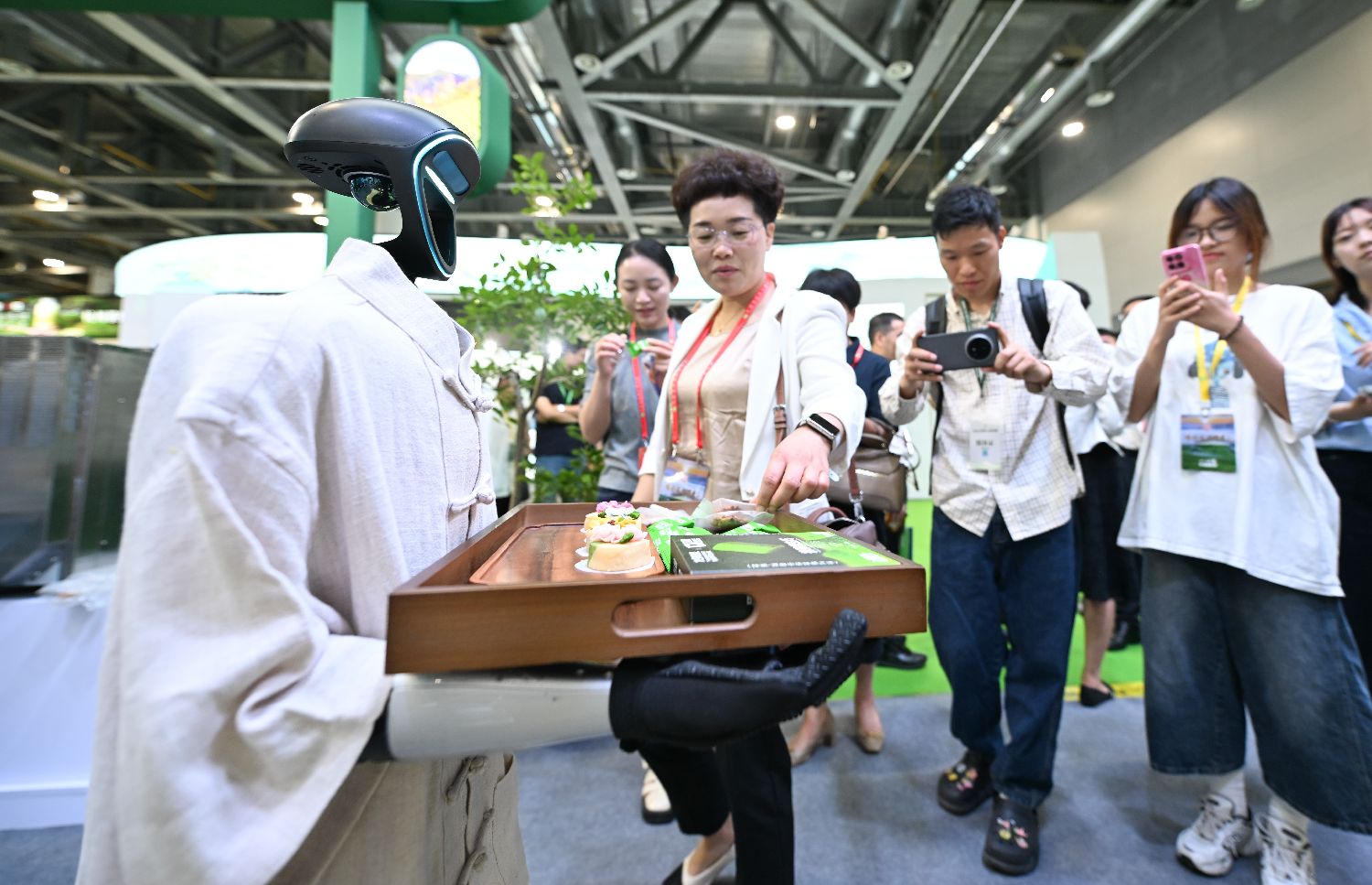 5月21日,人形机器人为参观者送茶产品。当日,第七届中国国际茶叶博览会在浙江杭州开幕,各地茶商集中展示各式茶饮、茶具等,吸引民众参观。(中新社)